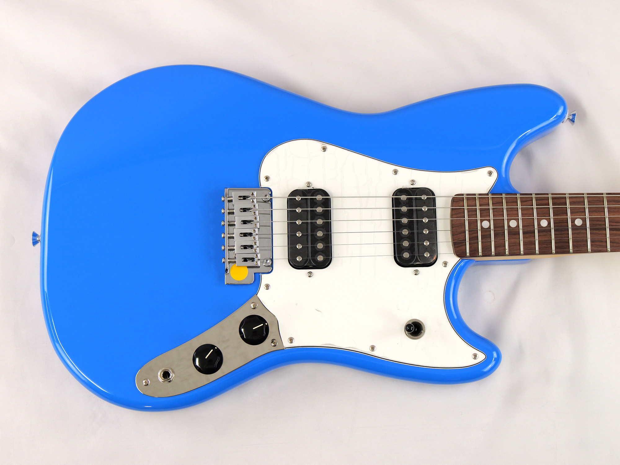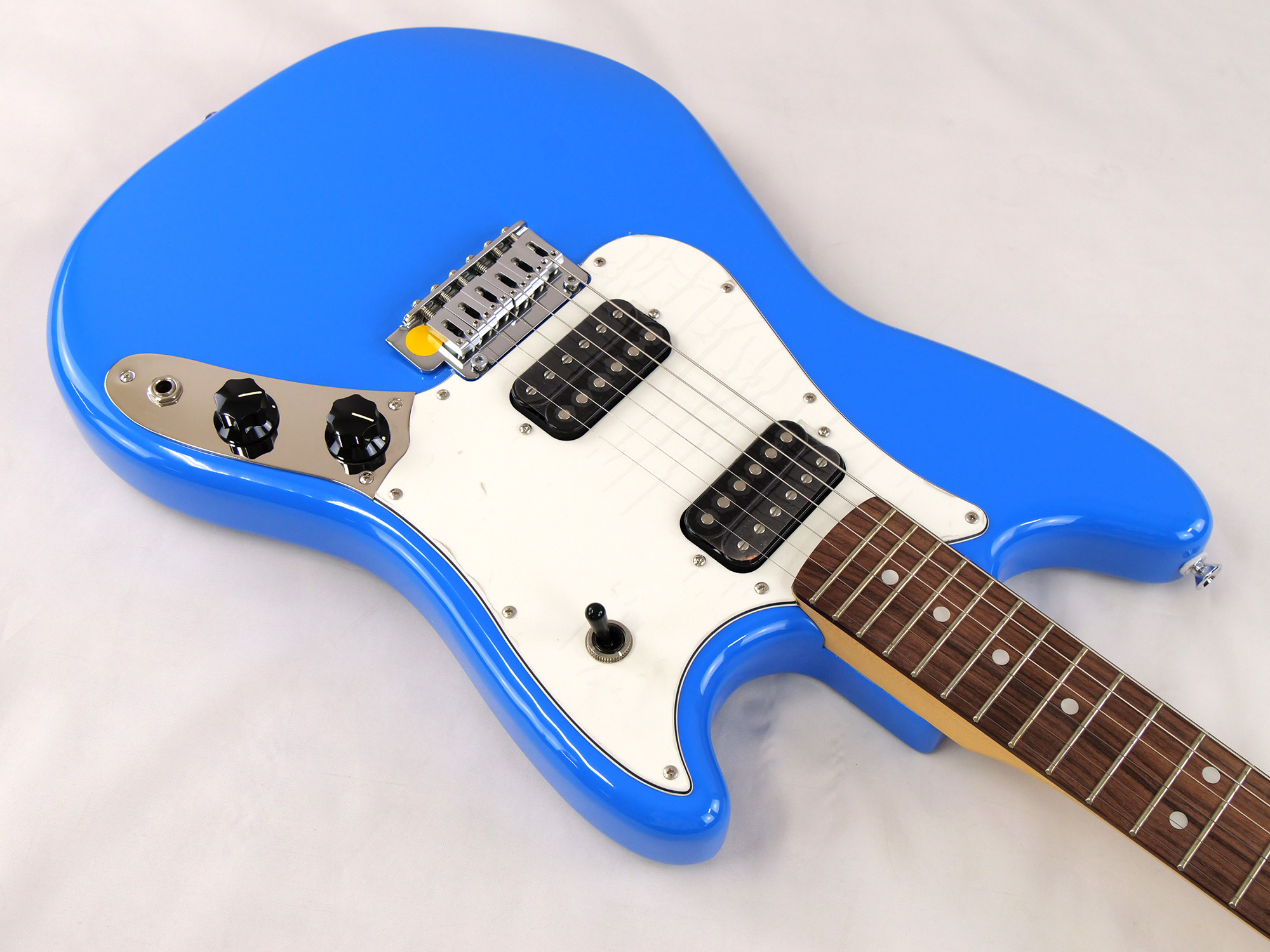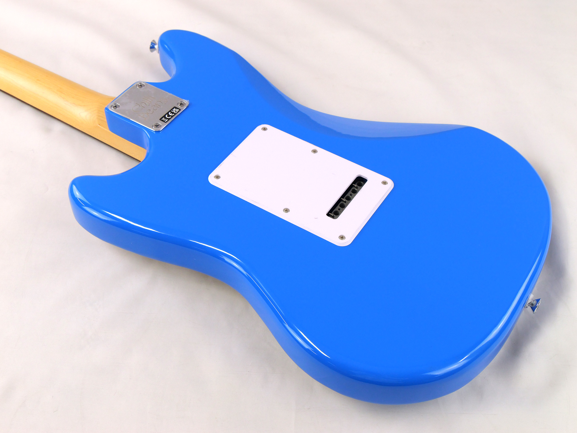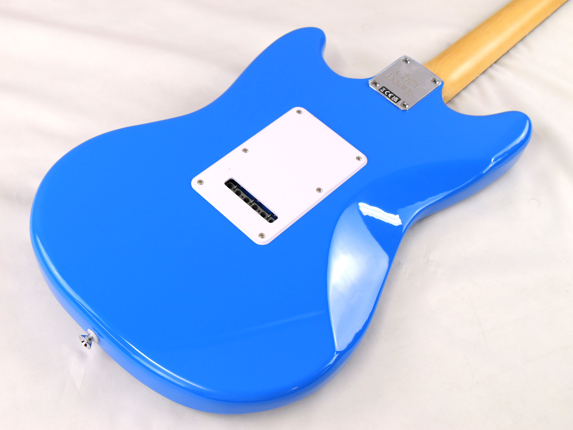 本モデルのために調色した新色のブルーカラーに、ホワイトのロゴとパーチメントのピックガードが落ち着いた爽やかさのあるデザインです。