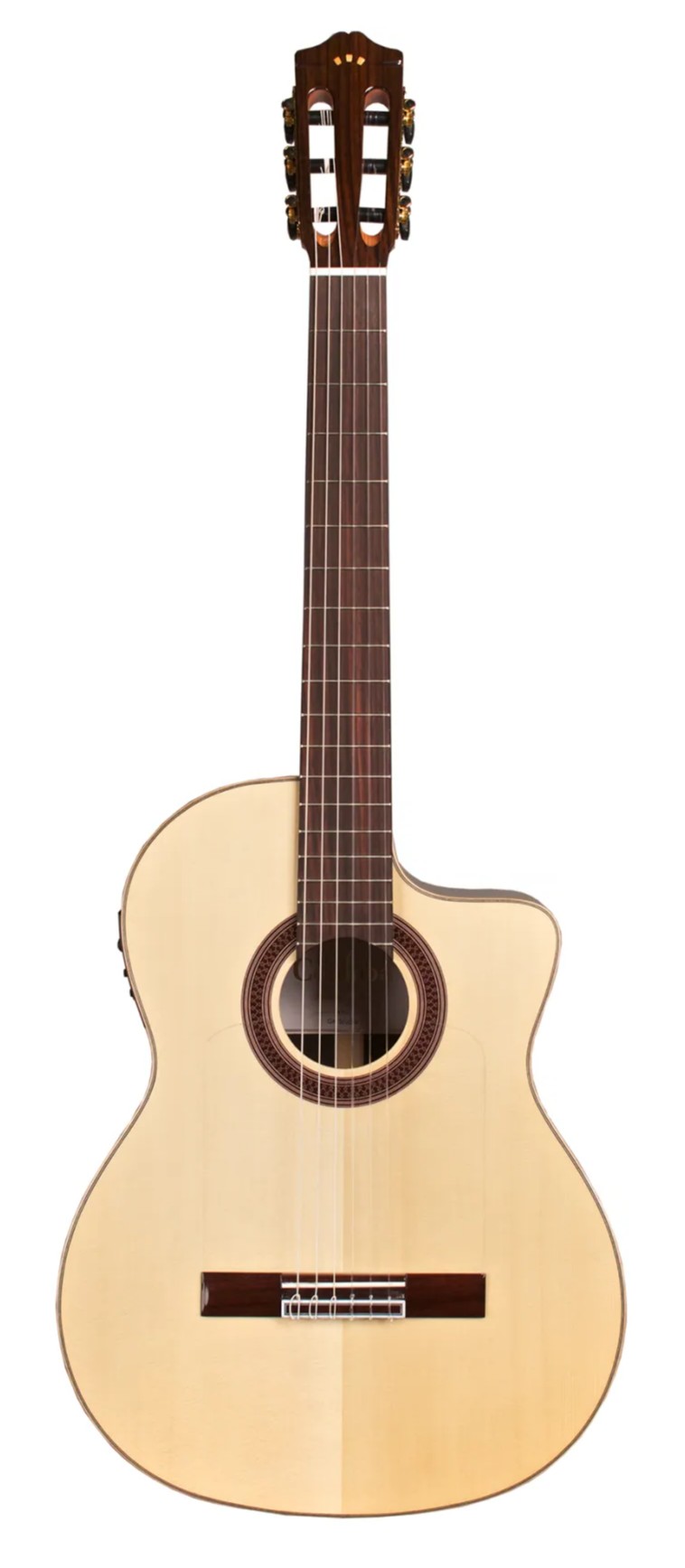 ソリッド・ヨーロピアン・スプルースをトップに、印象的な模様を持つジリコテをバック&サイドに使用した、実にステージ映えのするフラメンコギターです。ジリコテは温かみのある豊かでなめらかなサウンドを提供します。