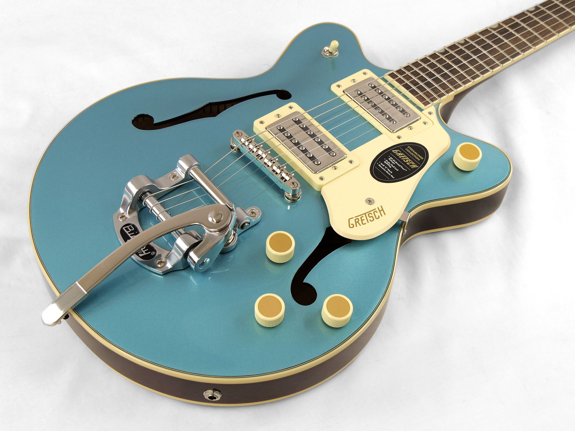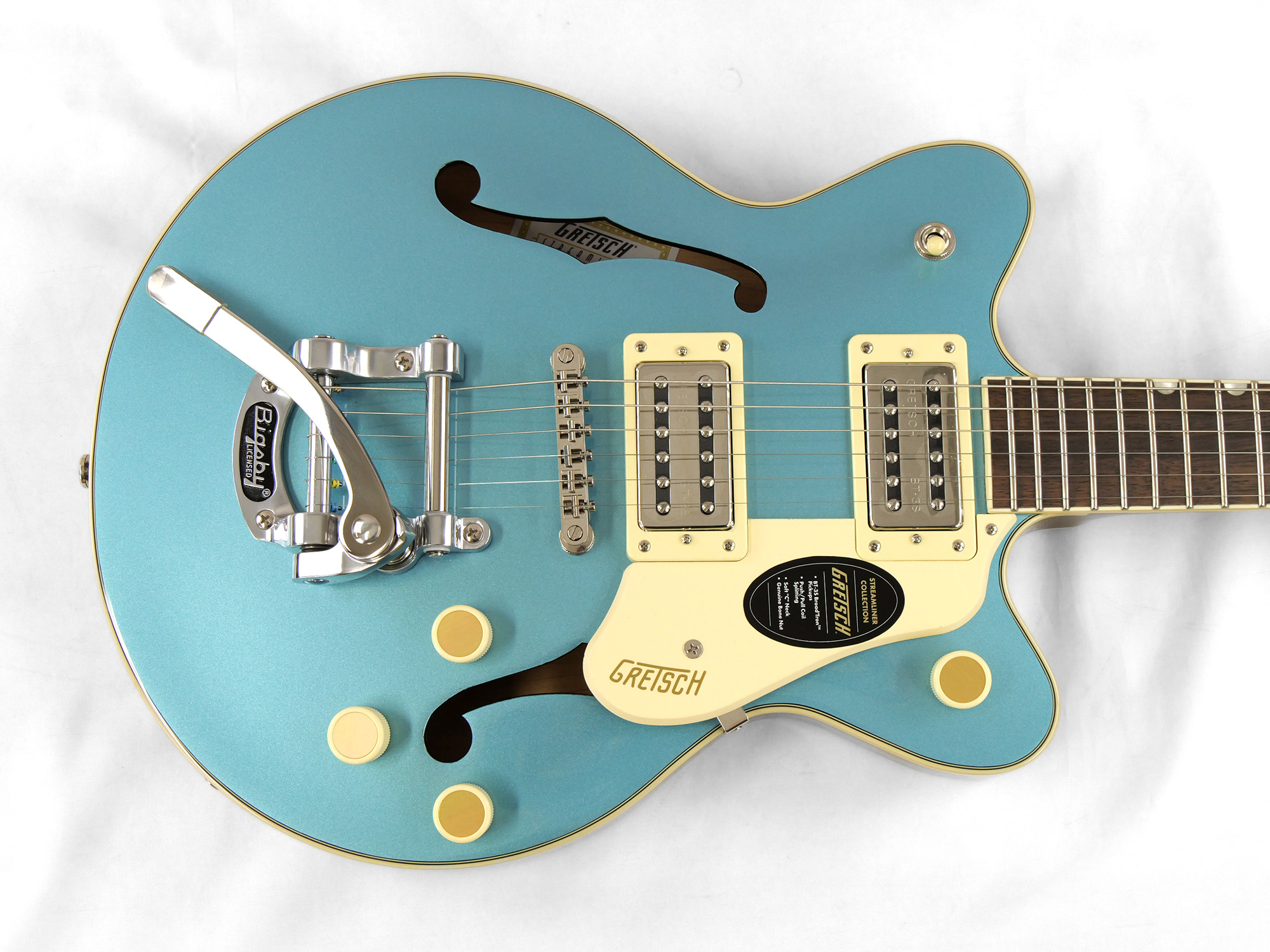 G2655T Streamliner™ Center Block Jr. Double-Cut with Bigsby®は、パワフルなサウンドとGretschならではのスタイリングをよりコンパクトなサイズに収め、現代に甦らせました。G2655Tは、グレッチに期待されるすべての要素を保ちつつ、楽器にワンランク上のパフォーマンス、スタイル、そしてより大きな音量感を求めるギタリストのために設計されています。