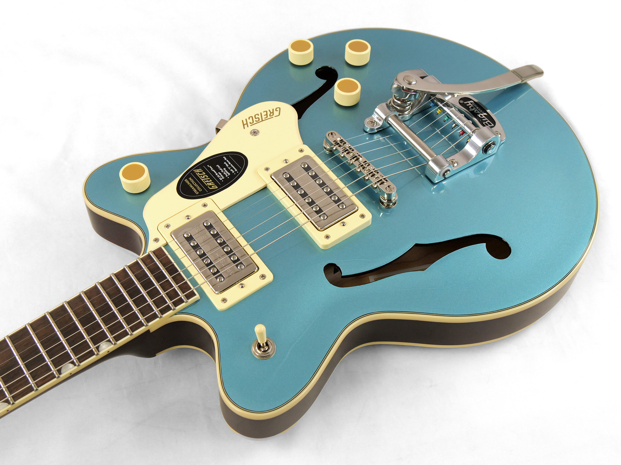 新しいセンターブロックデザインのメイプルボディ G2655T Center Block Jr.は、小さめのアーチドメイプルボディに、新しいセンターブロックデザインを採用しています。この新しいセンターブロックは、軽量で快適な演奏性と存在感のあるフルでリッチなサウンドを両立するように設計されており、アタックとサスティンを向上させ、優れたフィードバック抑制効果を、重さを感じさせない快適なギターにまとめ上げています。