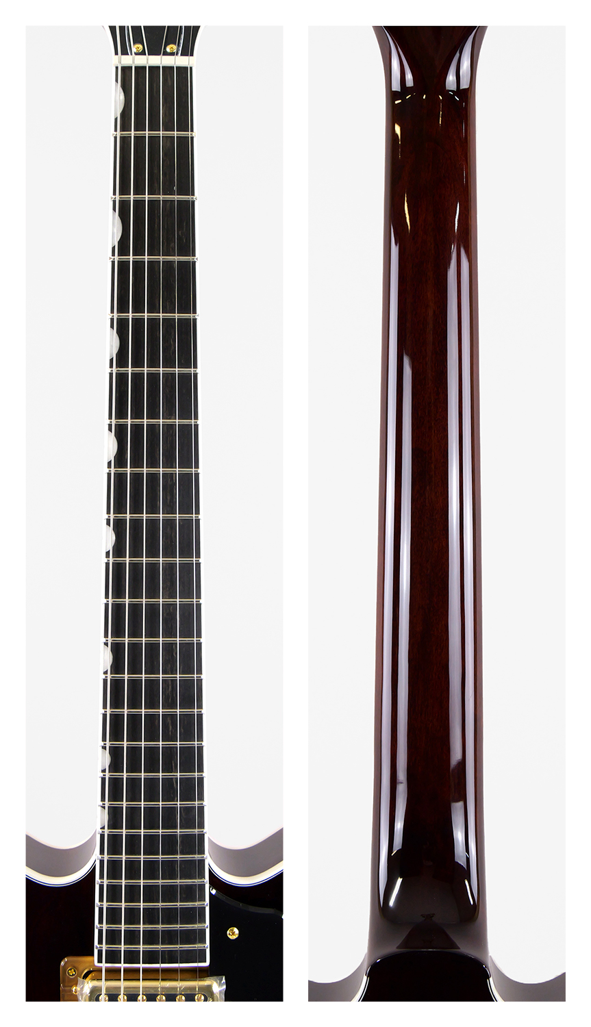 ・クラシックな“C”シェイプのメイプルネックパーロイド製Neo-Classic™サムネイルインレイ付き12インチラディアスのバウンドエボニー指板