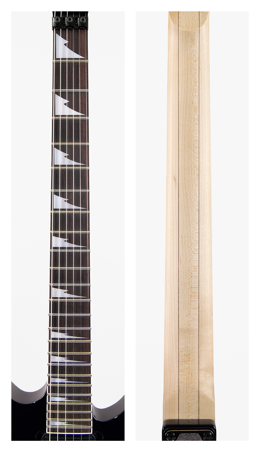 ☆ダイキャスト・プレートによるネック・ジョイントを採用しています。ヒール部分のボディをえぐるように大胆にカットしており、ハイフレット域の演奏性を高めています。