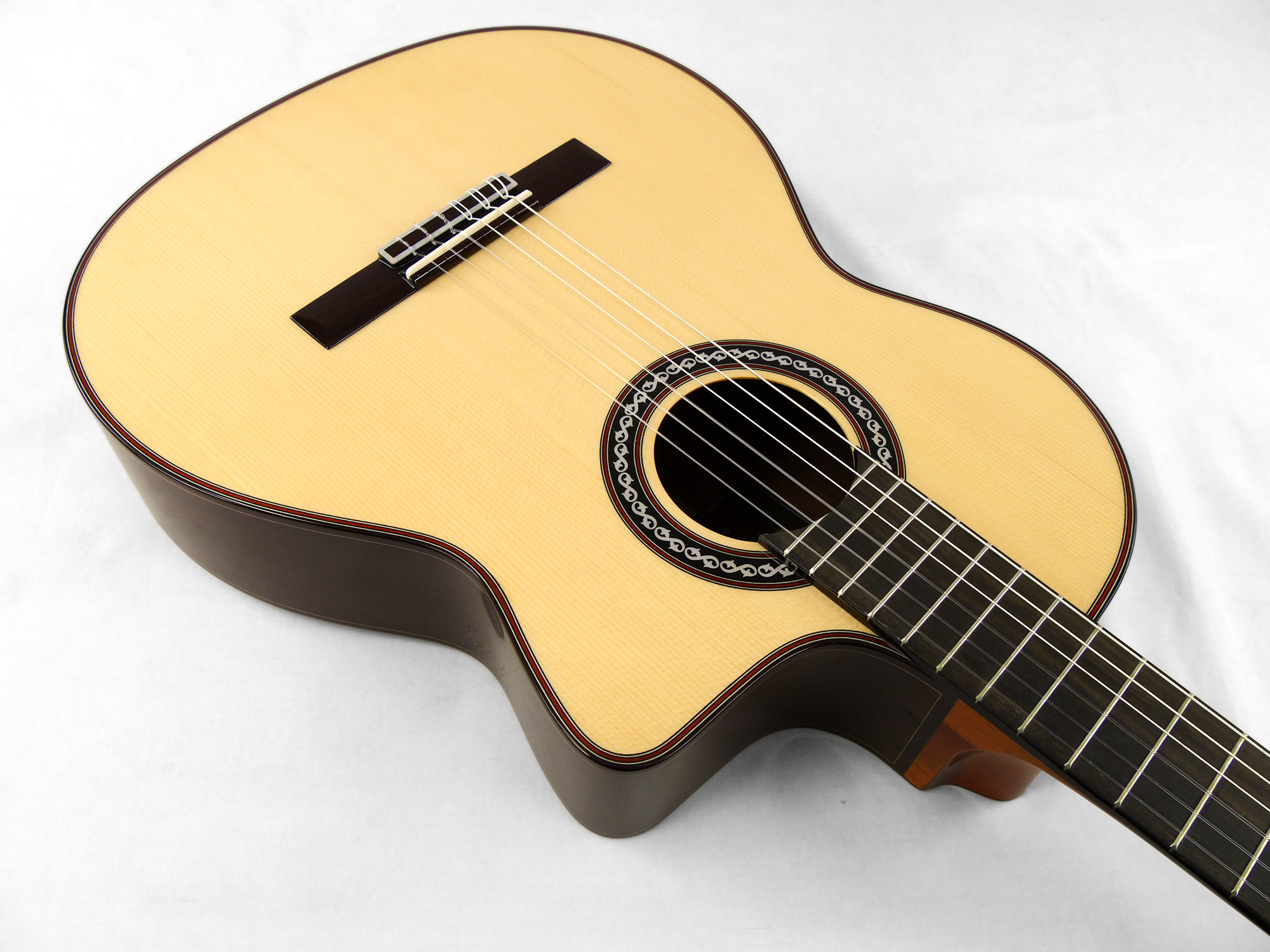 GK Pro NegraはCordobaのベストセラーのひとつであるGK Studio Negraの上位機種で、オールソリッドギターです。スリムなネックとCutawayにより幅広い演奏が可能になり、伝統のフラメンコギターのスナッピートーンを作り出す低い弦高にセットアップされています。ソリッドインディアンローズウッドのバック&サイドはバランスのとれたトレブルと共にリッチなベーストーンなど音色に新たな深みを加えています。Fishman’s Prefix Problend on-board electronics 3-band EQ仕様。湿度や気温によるネックの変化に対応可能なアジャスタブル・ロッド仕様です。