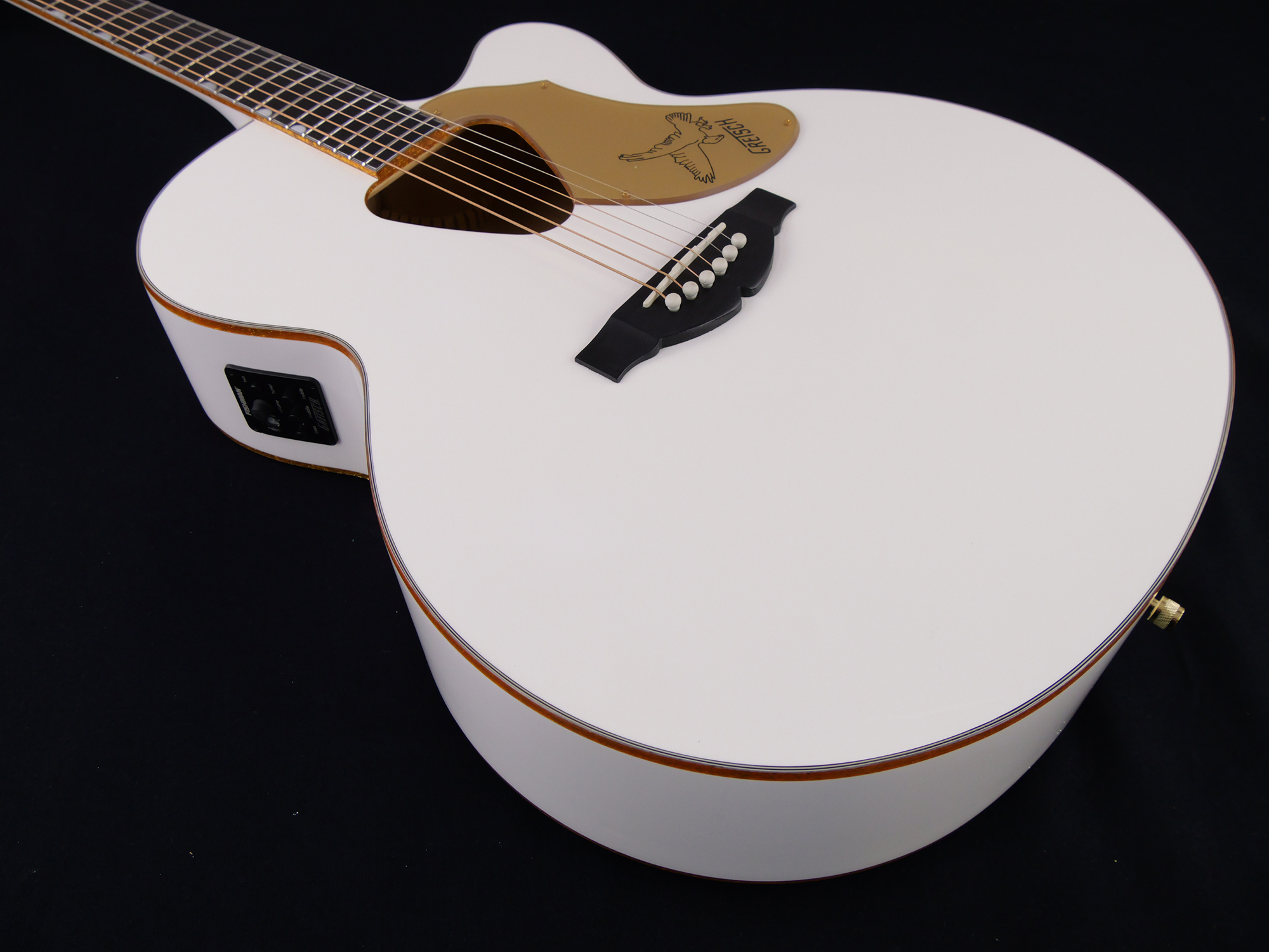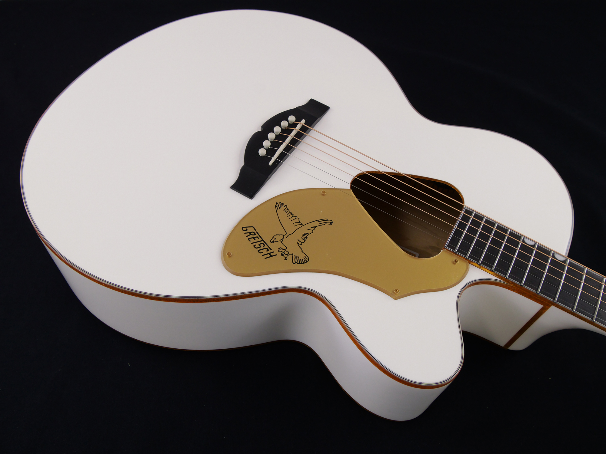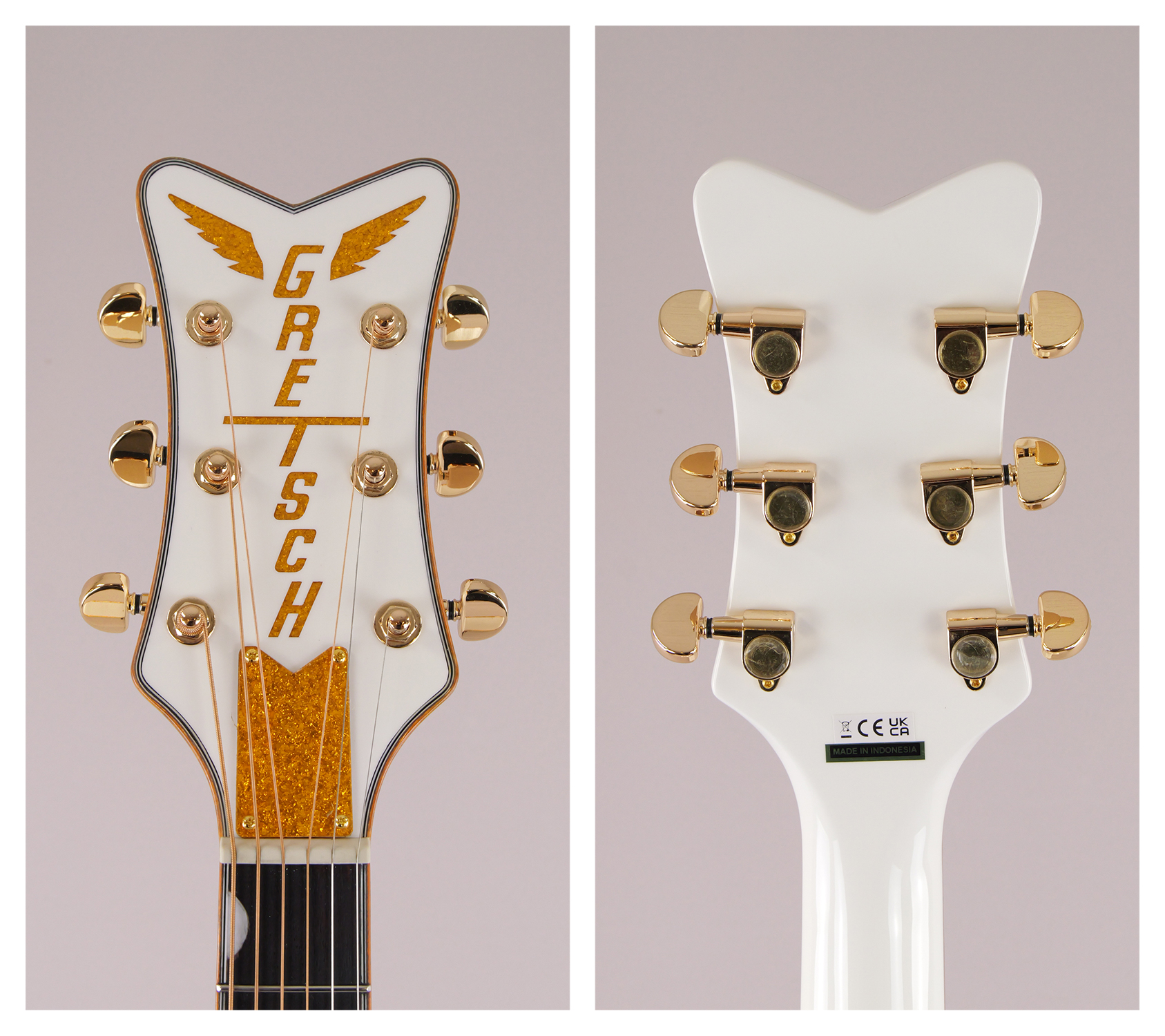 その他のプレミアムな仕様に、スキャロップドXブレイシング、クラシックなランチャータイプの三角型サウンドホールを備えた、ソリッドスプルース・ボディトップを使用。ボディ・サイドとアーチ状のボディ・バックにメイプル材を使用し、マホガニーネック、Neo-Classic™のサムネイル・インレイを装備した、21フレット仕様のローレル指板を採用。翼の付いた"Gretsch"スパークルロゴが入ったV字型ヘッドストック、ローズウッド台座付きコンペンセーテッド・ブリッジ、デラックスチューナー、金メッキされたハードウェアを採用しています。