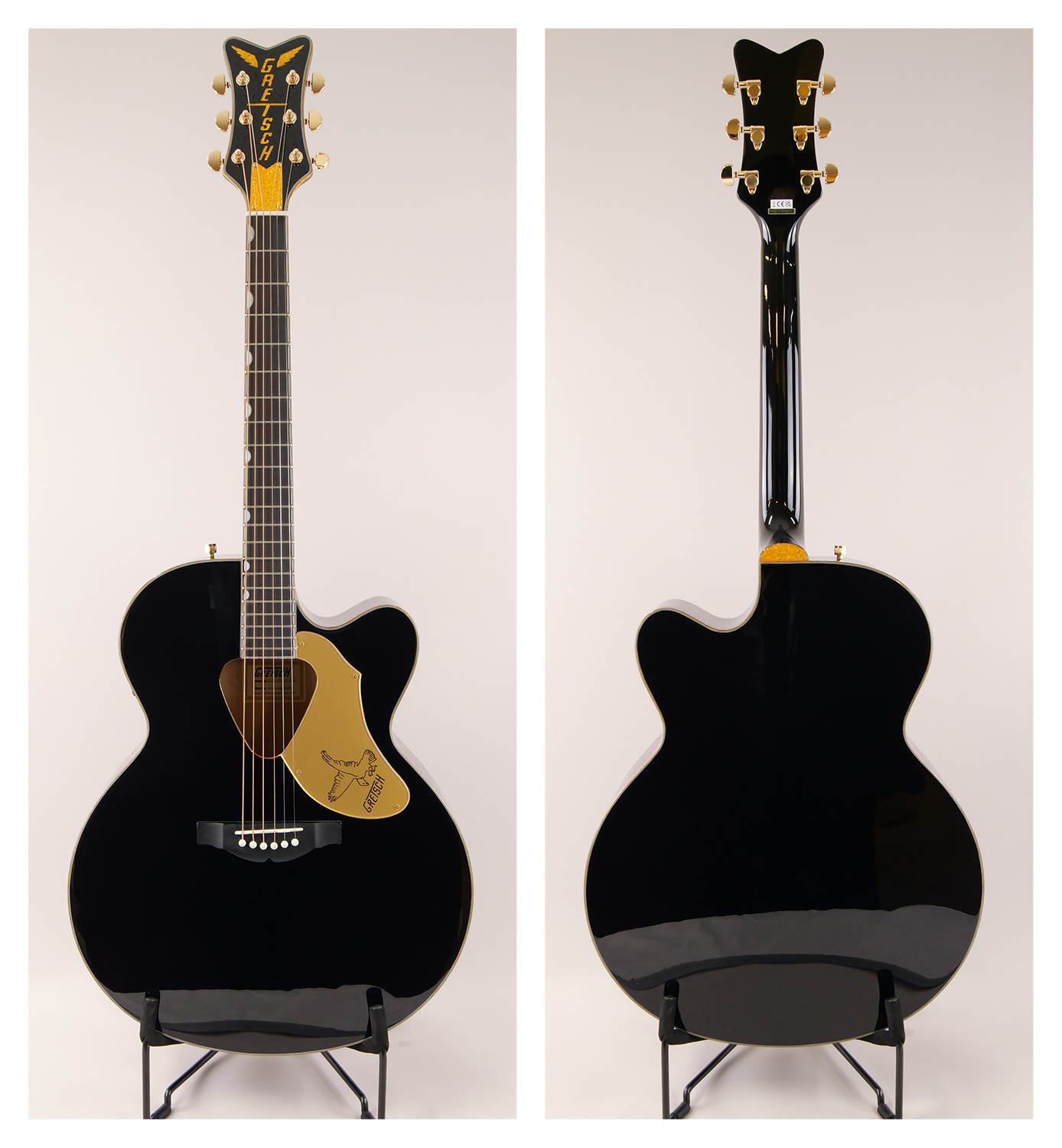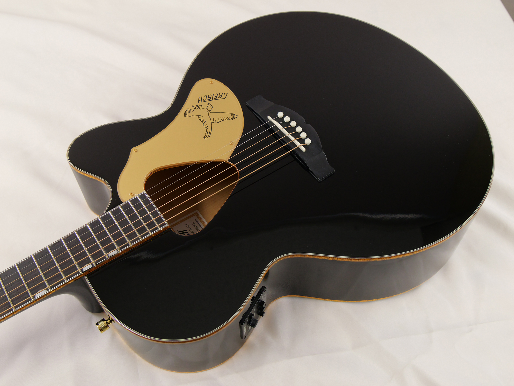 その他のプレミアムな仕様に、スキャロップドXブレイシング、クラシックなランチャータイプの三角型サウンドホールを備えた、ソリッドスプルース・ボディトップを使用。ボディ・サイドとアーチ状のボディ・バックにメイプル材を使用し、マホガニーネック、Neo-Classic™のサムネイル・インレイを装備した、21フレット仕様のローレル指板を採用。翼の付いた"Gretsch"スパークルロゴが入ったV字型ヘッドストック、ローズウッド台座付きコンペンセーテッド・ブリッジ、デラックスチューナー、金メッキされたハードウェアを採用しています。