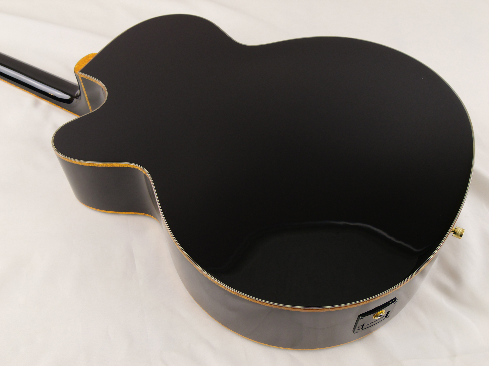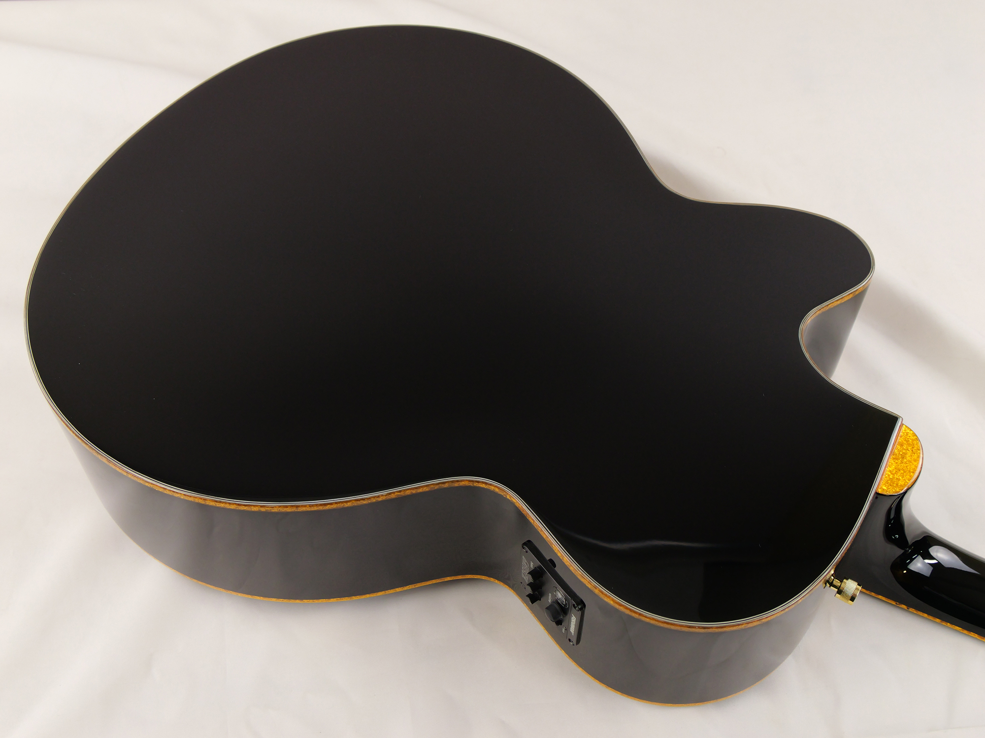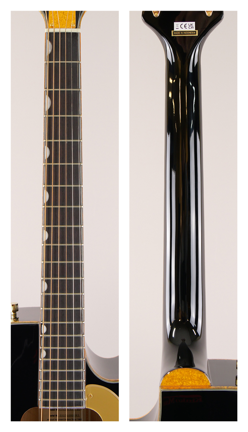 ジャンボカッタウェイを装備したボディを採用し、ボディ・トップ&バック、サウンドホール、指板、ヘッドストックに、光り輝くゴールドスパークルのバインディングが施されています。