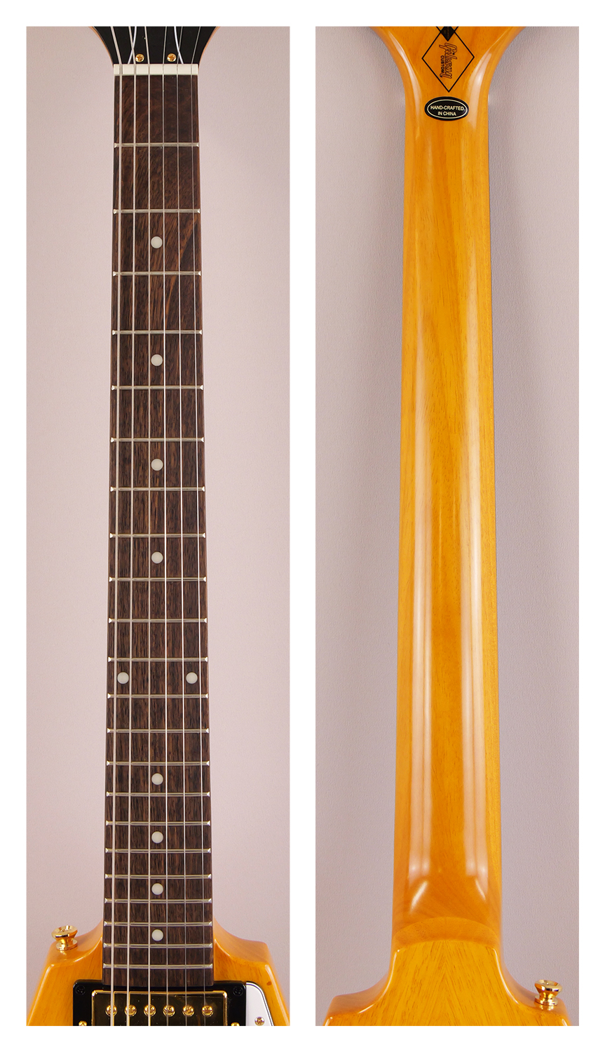 1958 年当時の超レアなギブソン・オリジナルモデルと同様に、コリーナ・ボディとコ リーナ・ネック、ボディとネックの強固な接合を実現するロング・ネックテノン、1958 フライングV ネック・プロファイル等、特徴的な仕様が網羅されています。また、指板は インディアン・ローレル材、ハードウェアにはゴールドパーツが採用されています。エレ クトロニクスについても最上のパーツが採用され、ピックアップには Gibson Burstbucker™ 2 とBurstbucker 3 がマウントされ、2 ボリューム/ 1 マスタートーン仕 様となります。CTSポットとマロリー・コンデンサー、Switchcraft®製の3 ウェイ・ ピックアップ・セレクタースイッチと1/4 インチ・アウトプットジャックを装備。