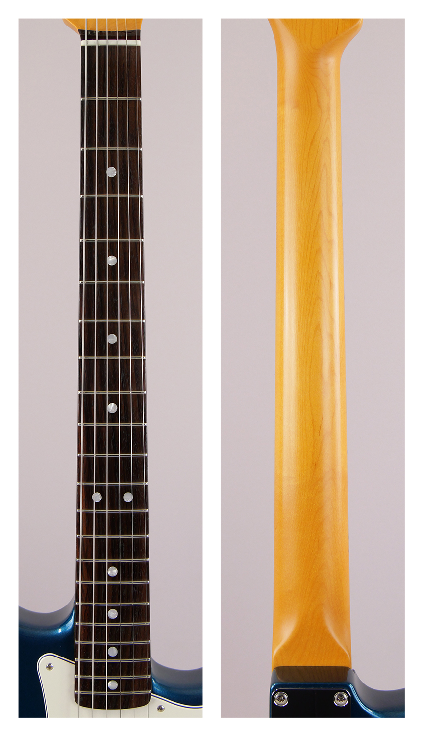 本人実機からプロファイルされたネックは7.25インチラディアスのラウンドローズ指板に約41mmのナット幅と薄めの1965 “C”シェイプとなっており、ヴィンテージの握り心地を忠実に再現しつつNarrow Tallフレットによりスムーズな演奏性を実現しています。