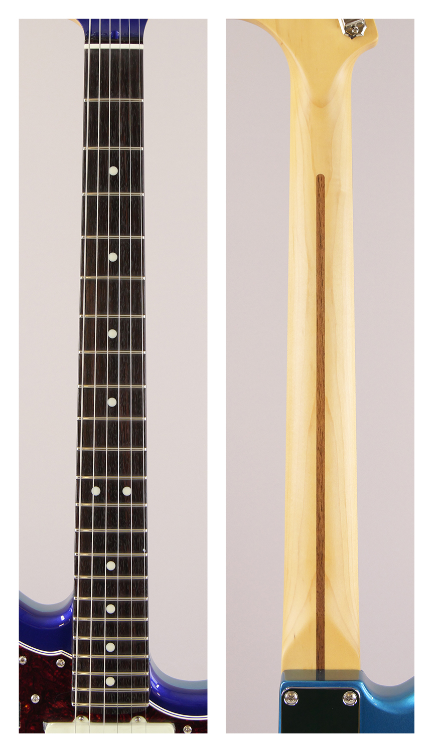Starcaster®の段付きかつ色を塗り分けたヘッドのデザインを、ボディのエルボーコンター部分にも採用しています。またそれぞれのカラーリングをマッチさせることで、この製品ならではのルックスに仕上げました。