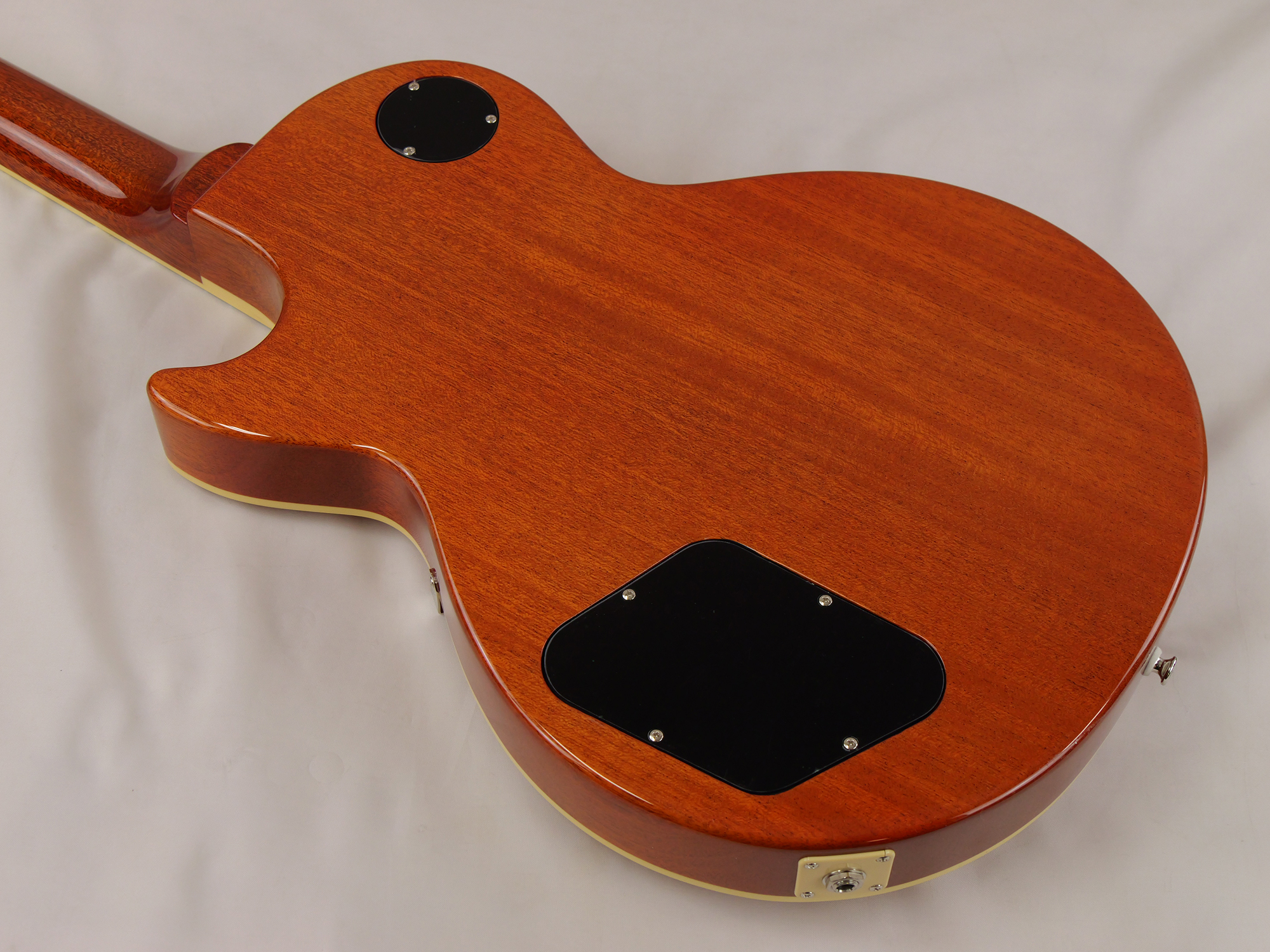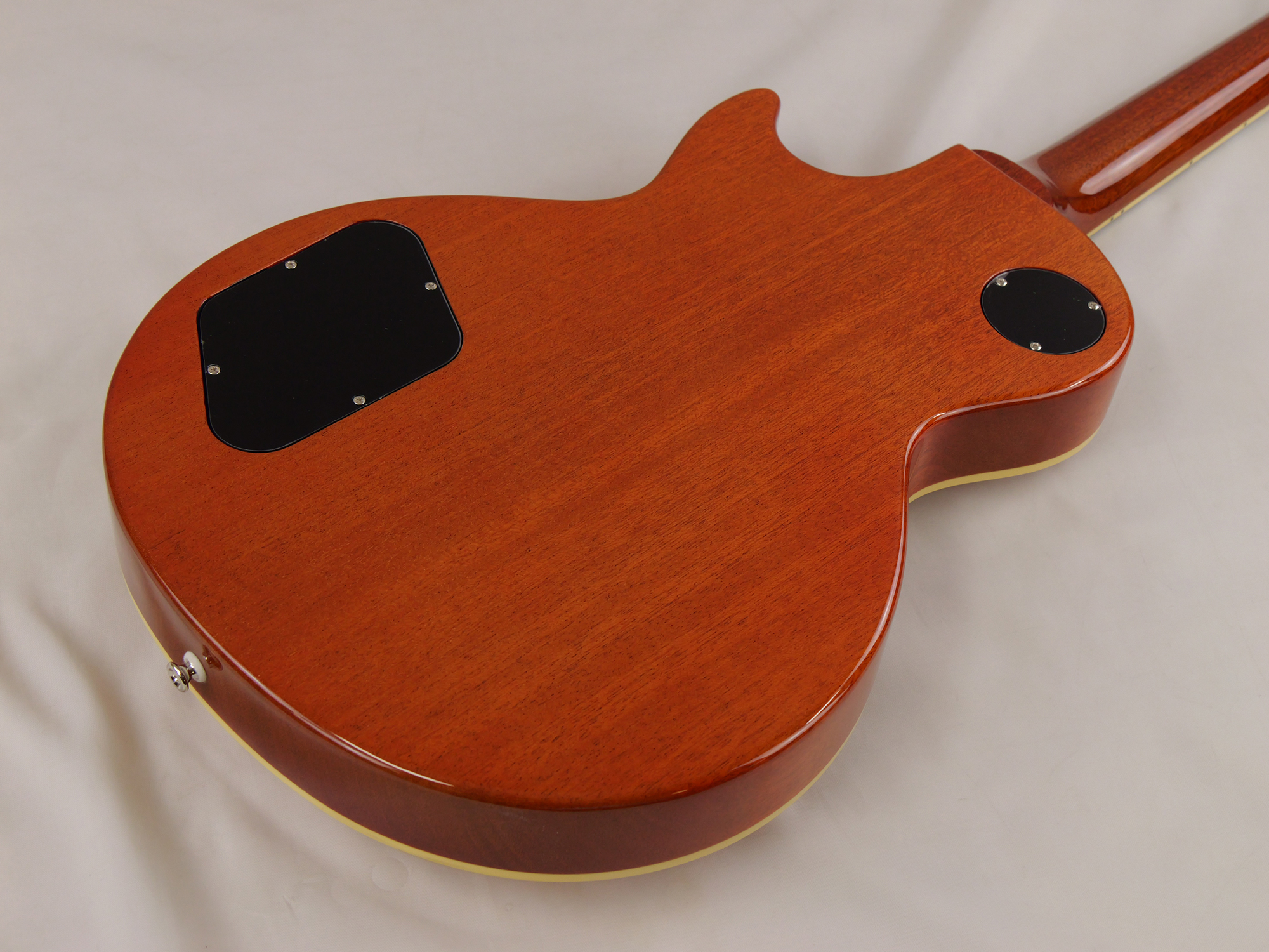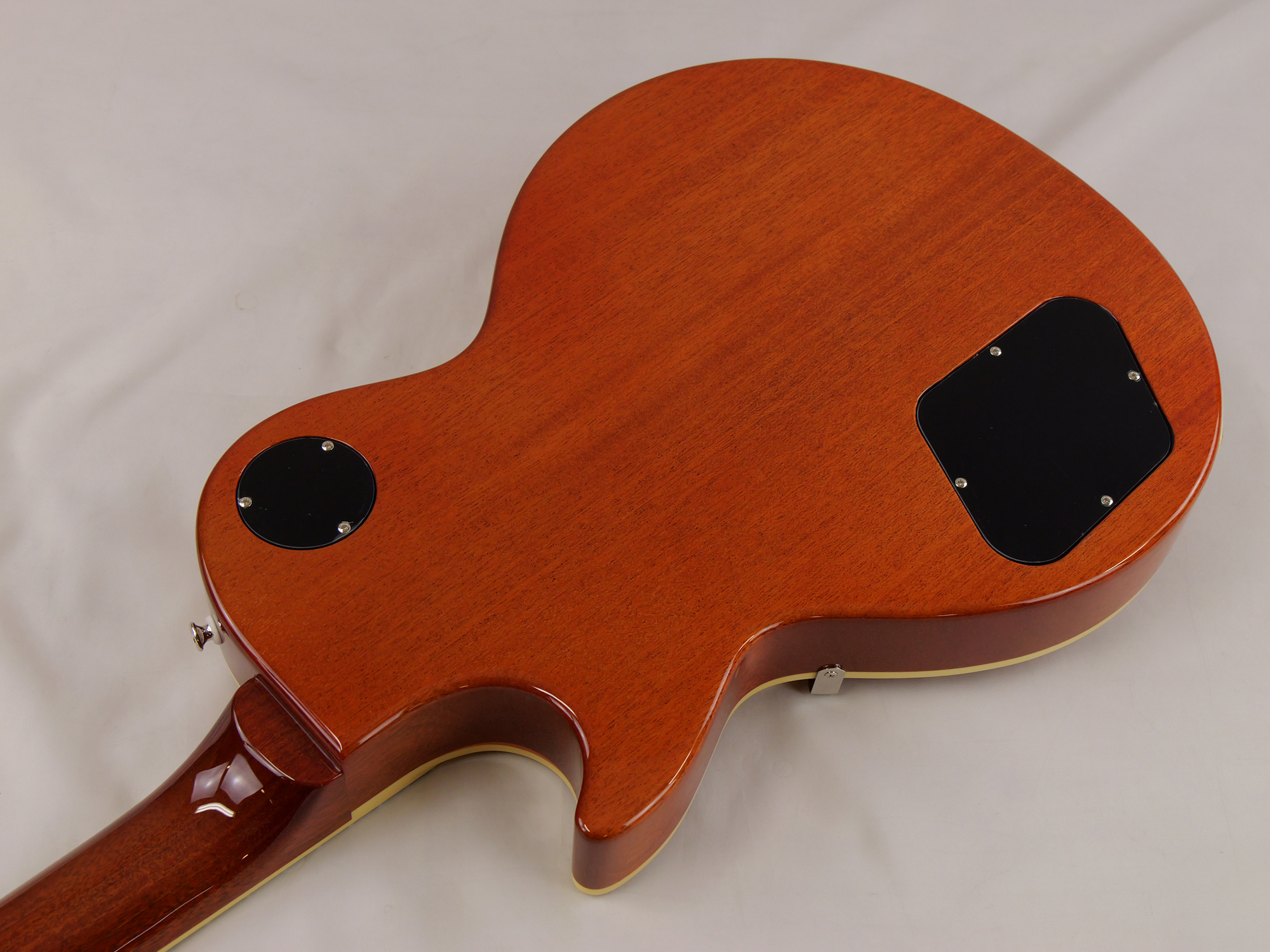 メイプルをトップにラミネートした王道のレスポール・スタンダード・スタイル。ネックとボディの接合には伝統的なニカワ接着が採用されており、セットネックならではの響きの一体感がしっかりと感じられます。