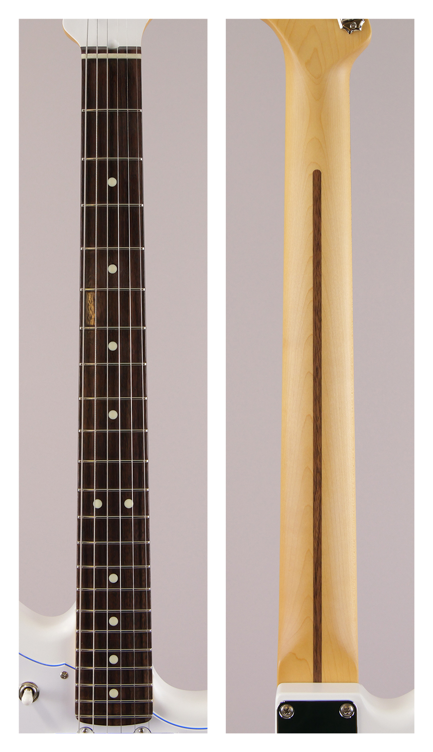 サテン仕様のホワイトなボディに、目を引くブルーのセンターレイヤーを纏った3-Plyホワイトピックガードを搭載しており、ボディとマッチングさせたヘッドに輝くブルーメタルロゴと相まって軽快な雰囲気を醸し出します。 プラスチックパーツも全てホワイトで統一することで、より純白さを際立たせます。