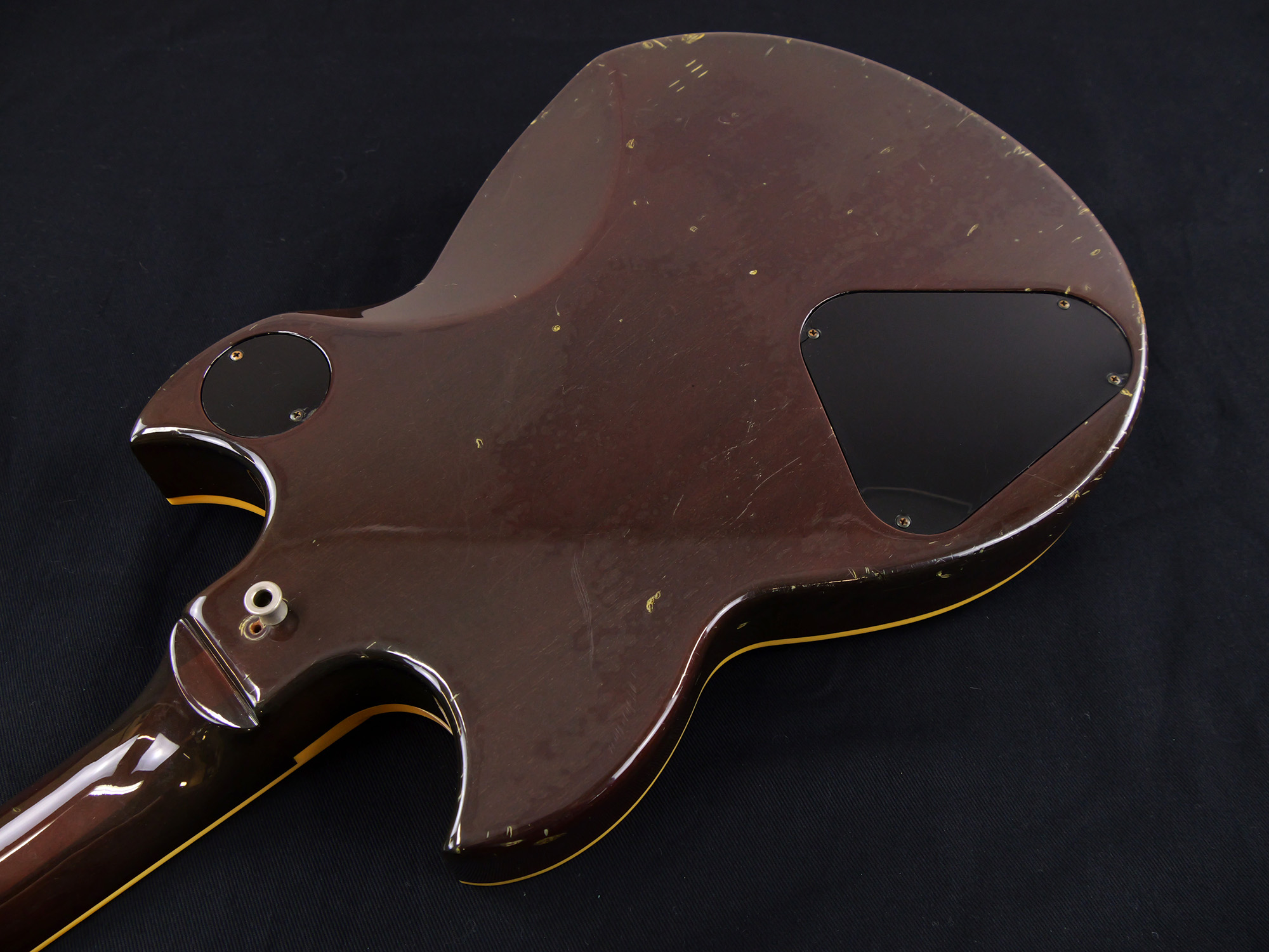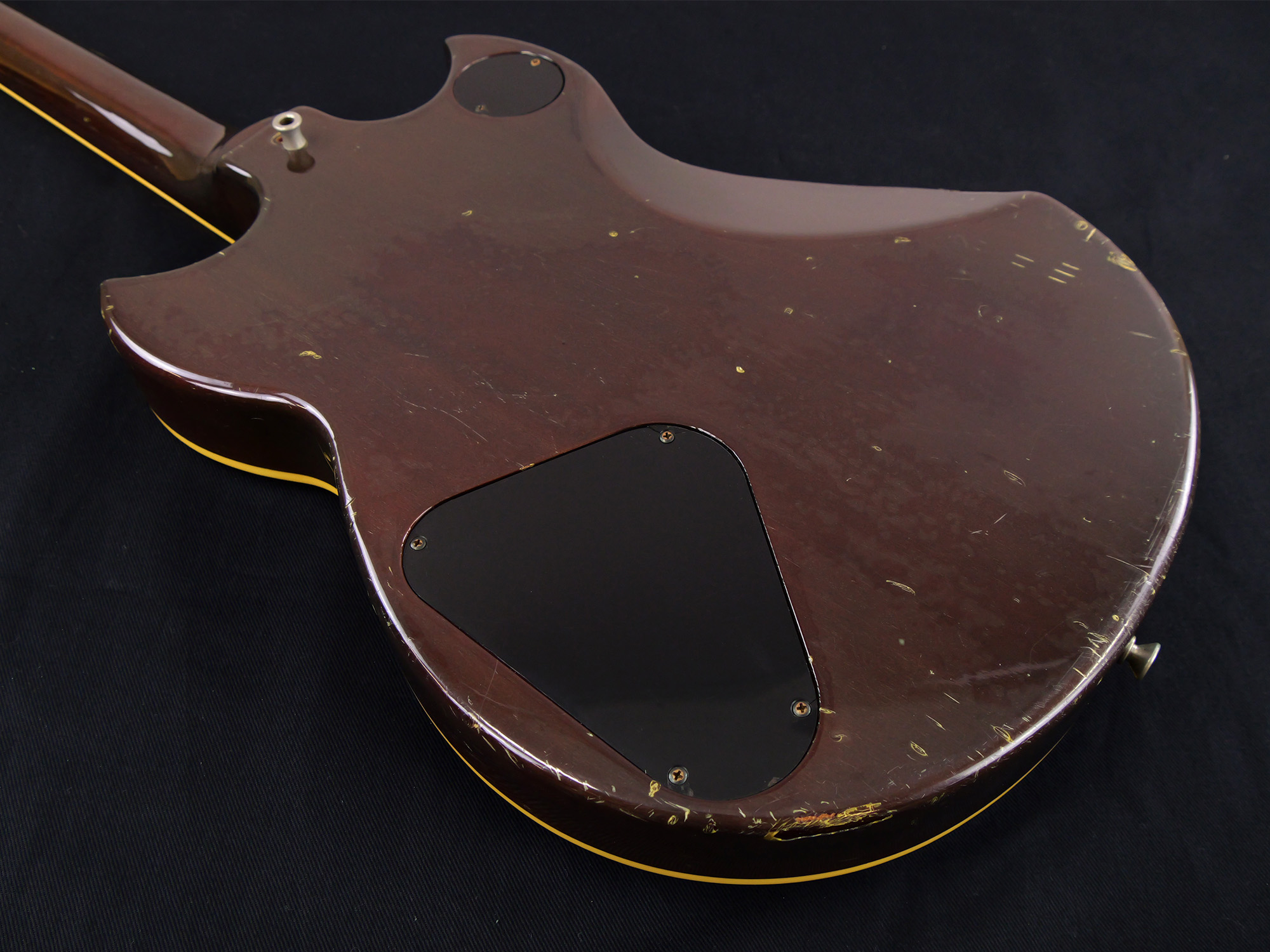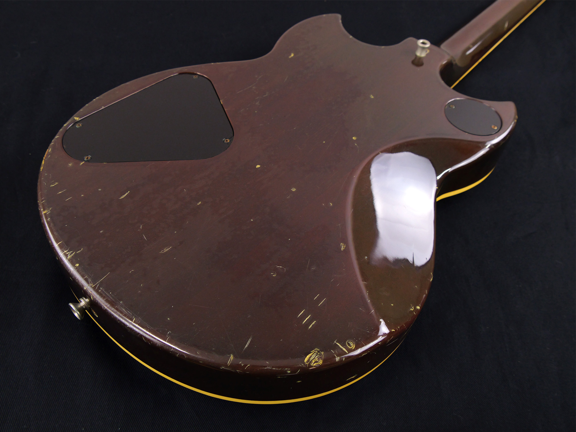 全体的に打痕や擦り傷、バックル傷などが点在しており、金属パーツのメッキ剥がれやくすみも目立ちます。かなり使い込まれたルックスではありますが、その分気兼ねなくガンガン弾いていただける一台です。