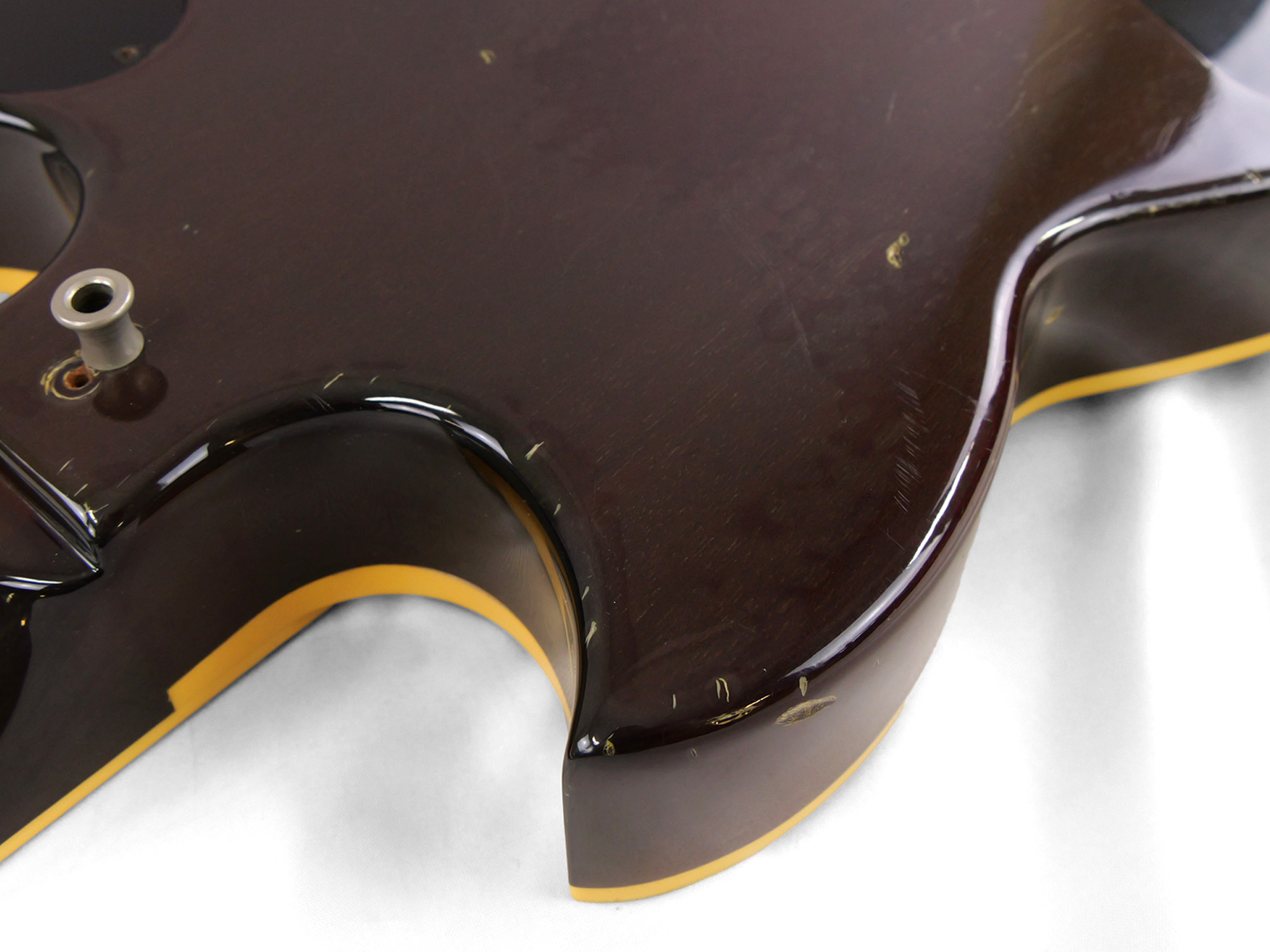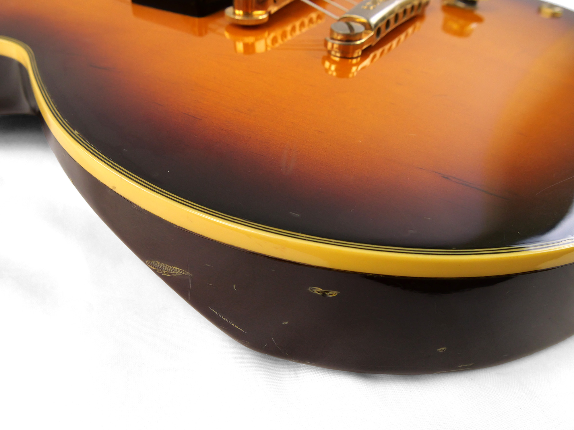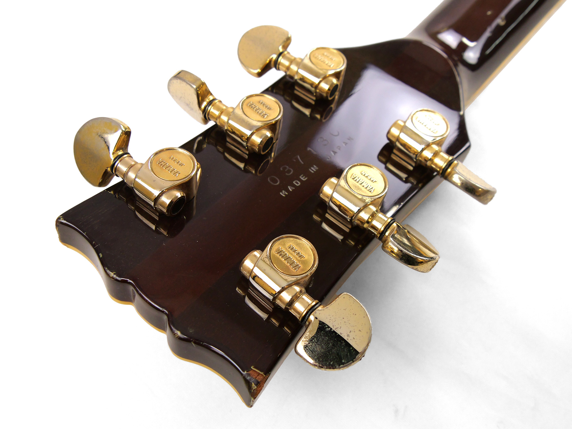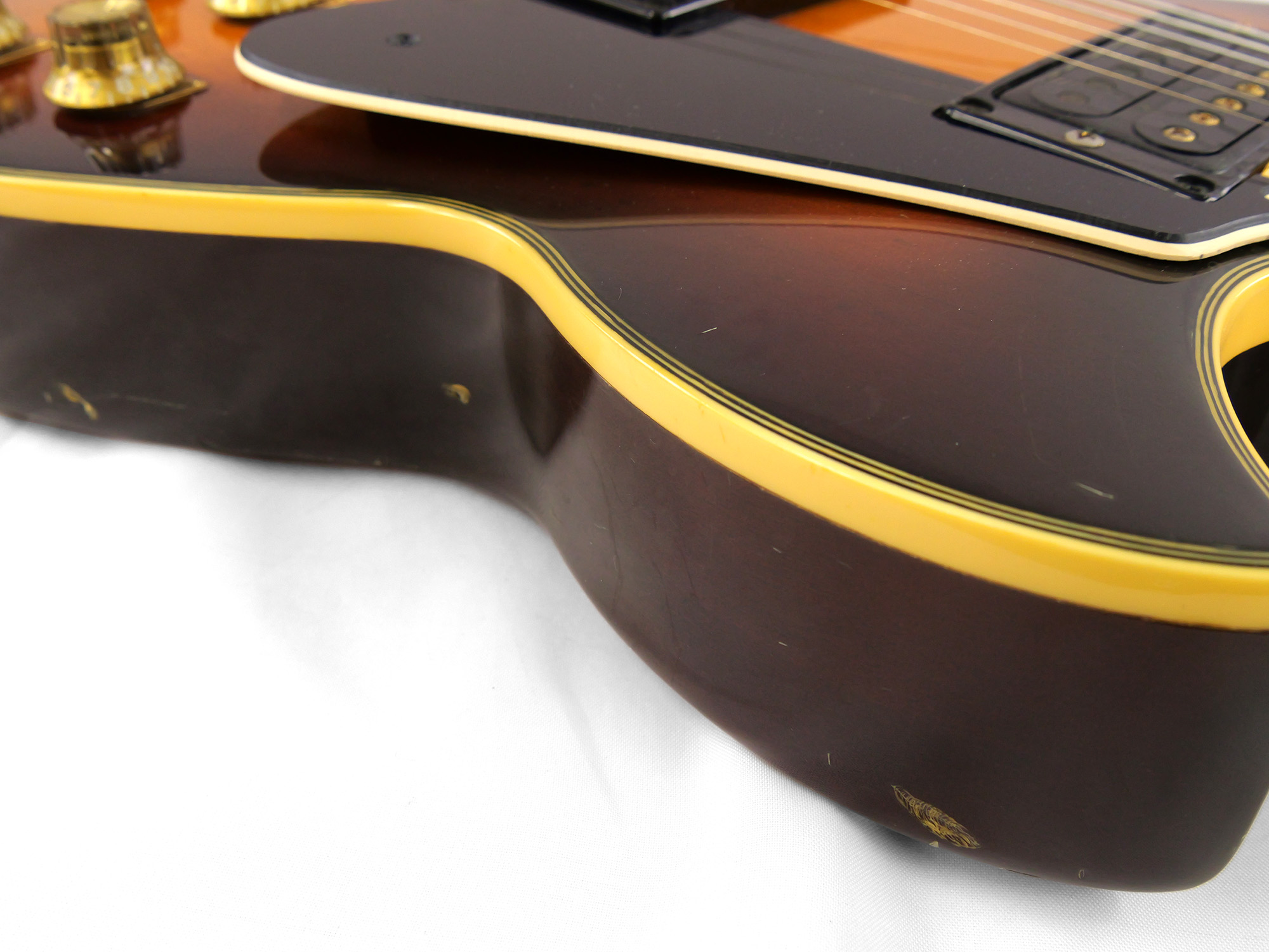 全体的に打痕や擦り傷、バックル傷などが点在しており、金属パーツのメッキ剥がれやくすみも目立ちます。かなり使い込まれたルックスではありますが、その分気兼ねなくガンガン弾いていただける一台です。