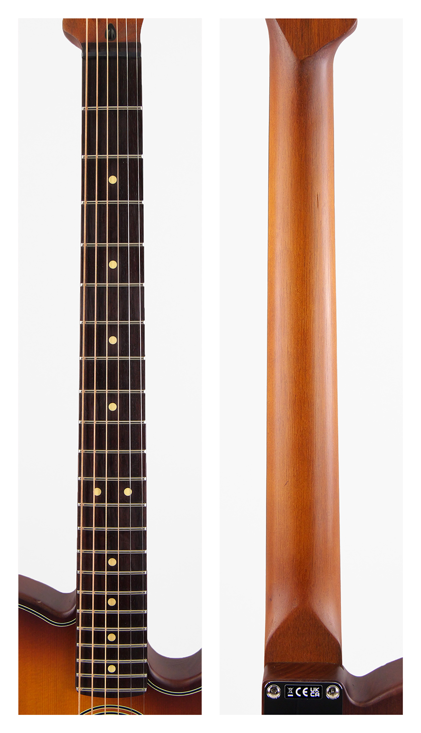 エレキギターと全く同じ感覚で弾けるネックシェイプを採用。アコギの太いネックが苦手な方や、