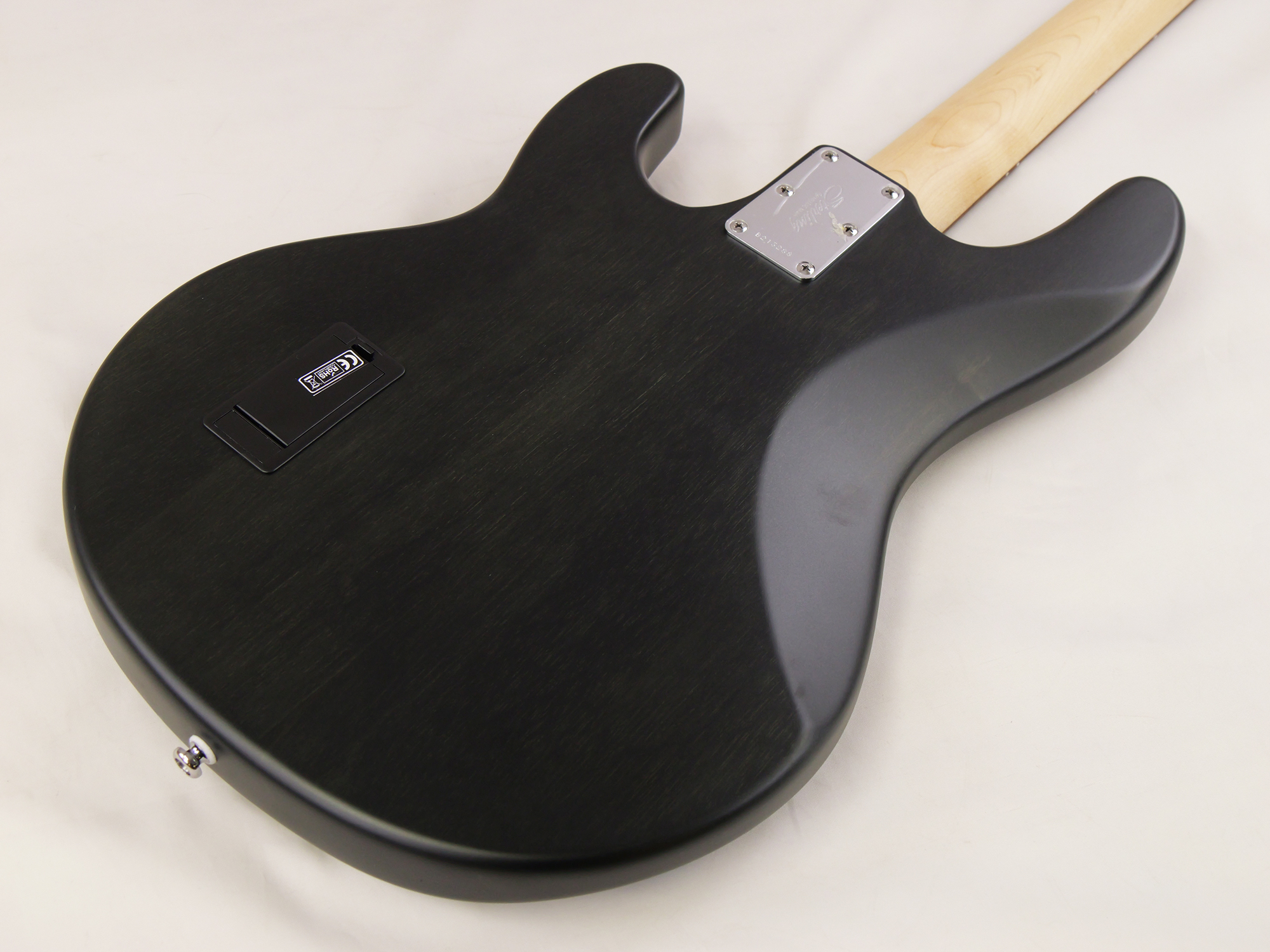バスウッドボディにメイプルネック、6点止めボルトオン、ミュージックマンデザインによるオリジナルブリッジを搭載、約3.8mmのナット幅。