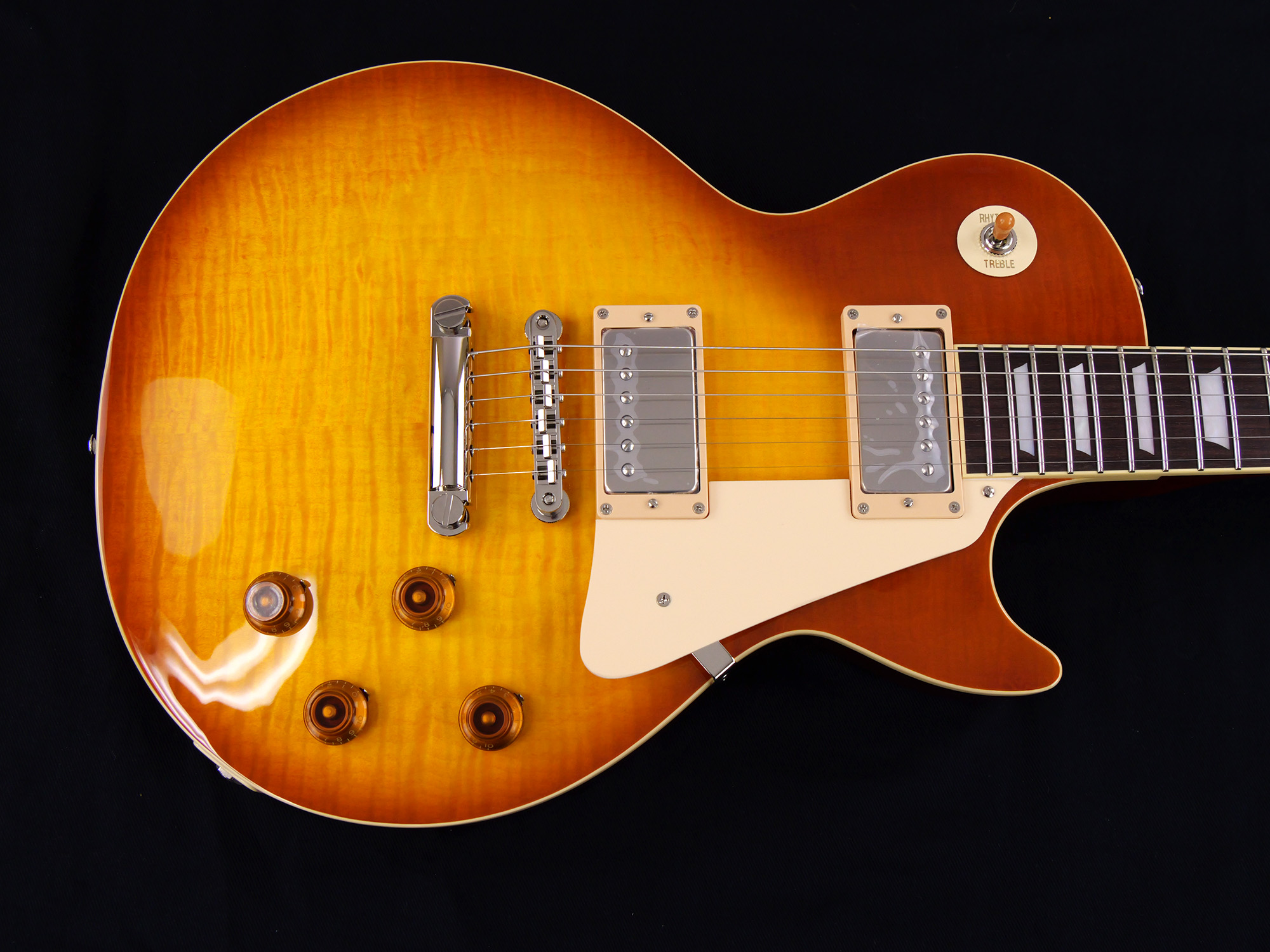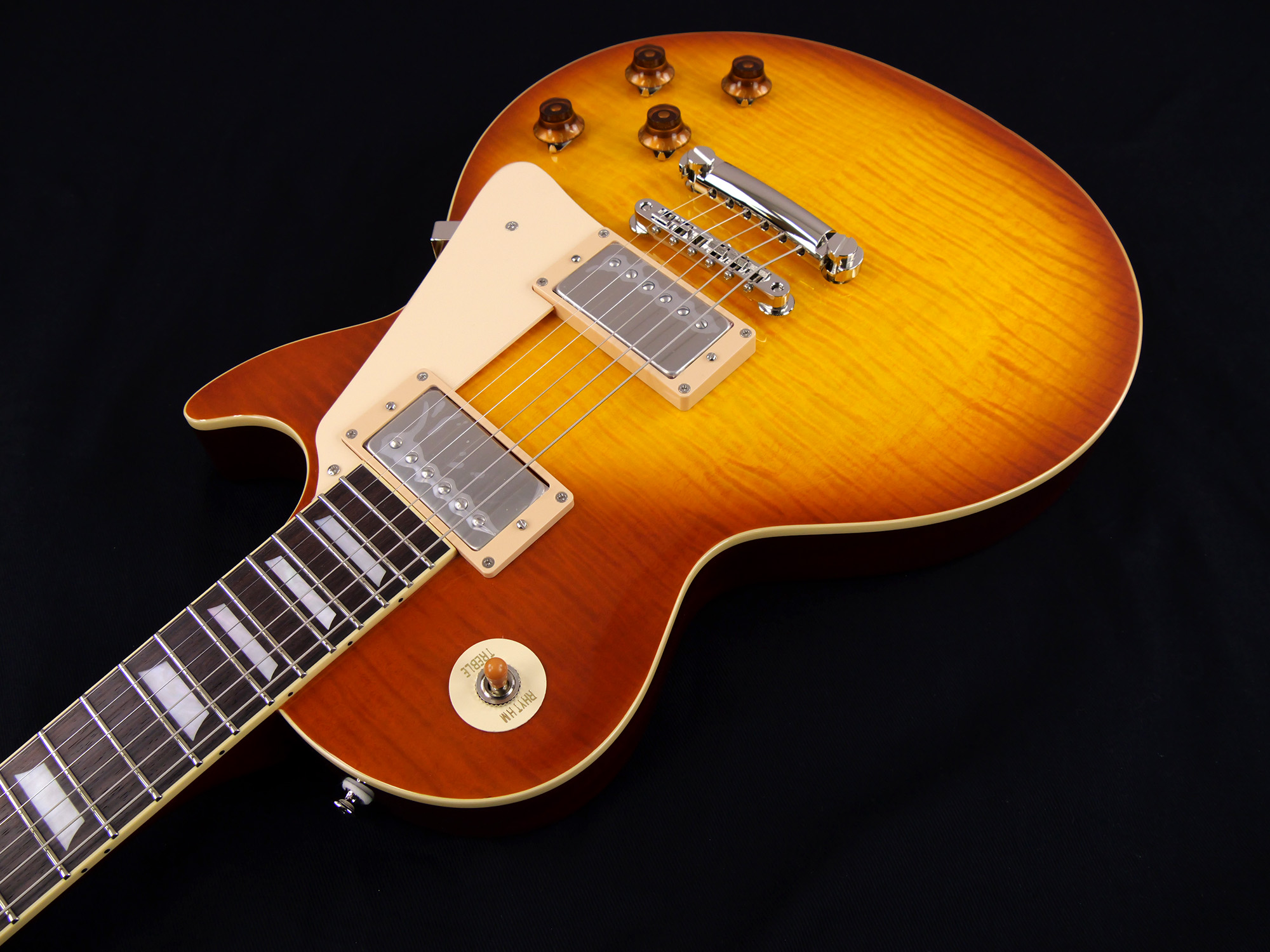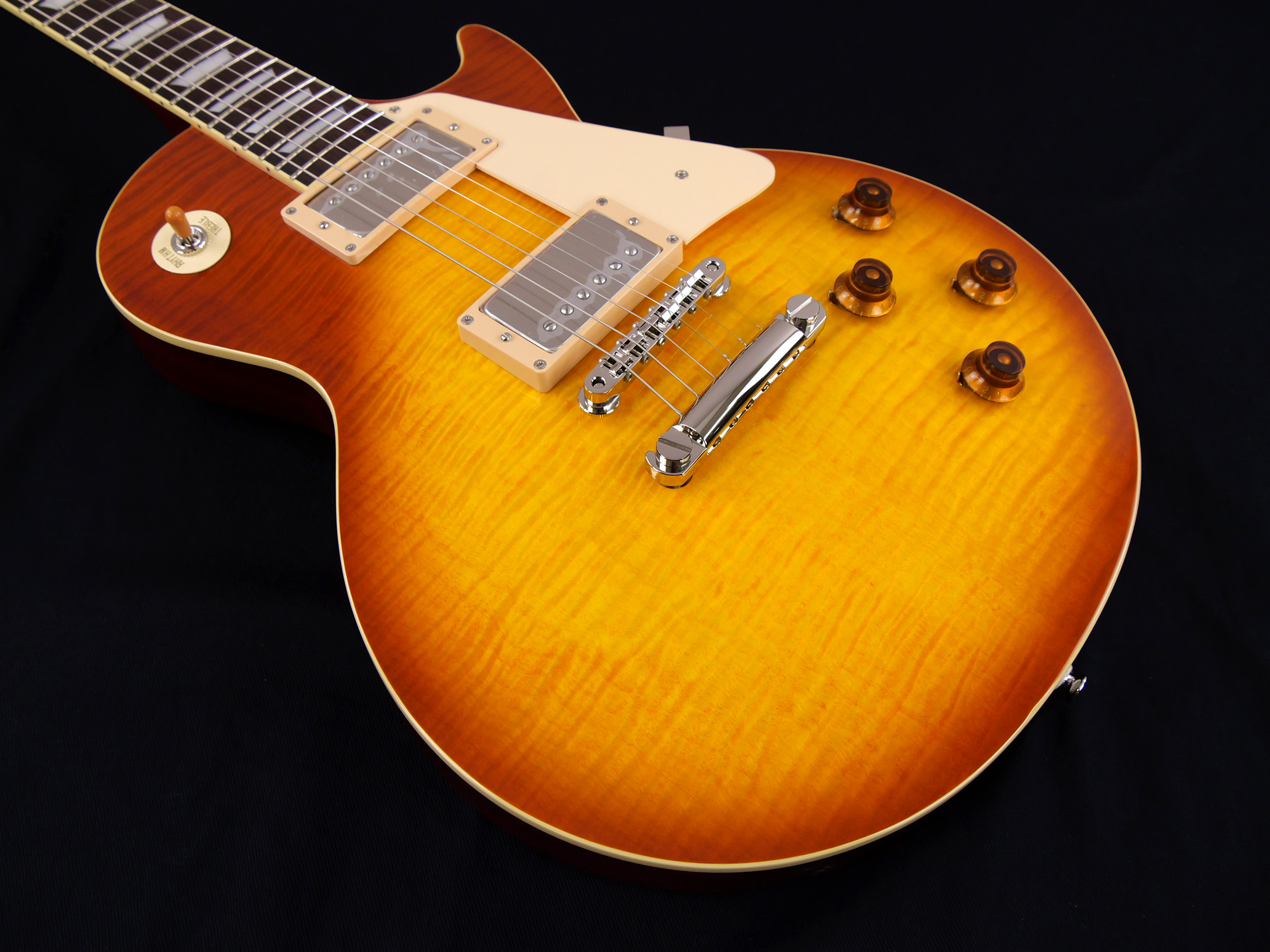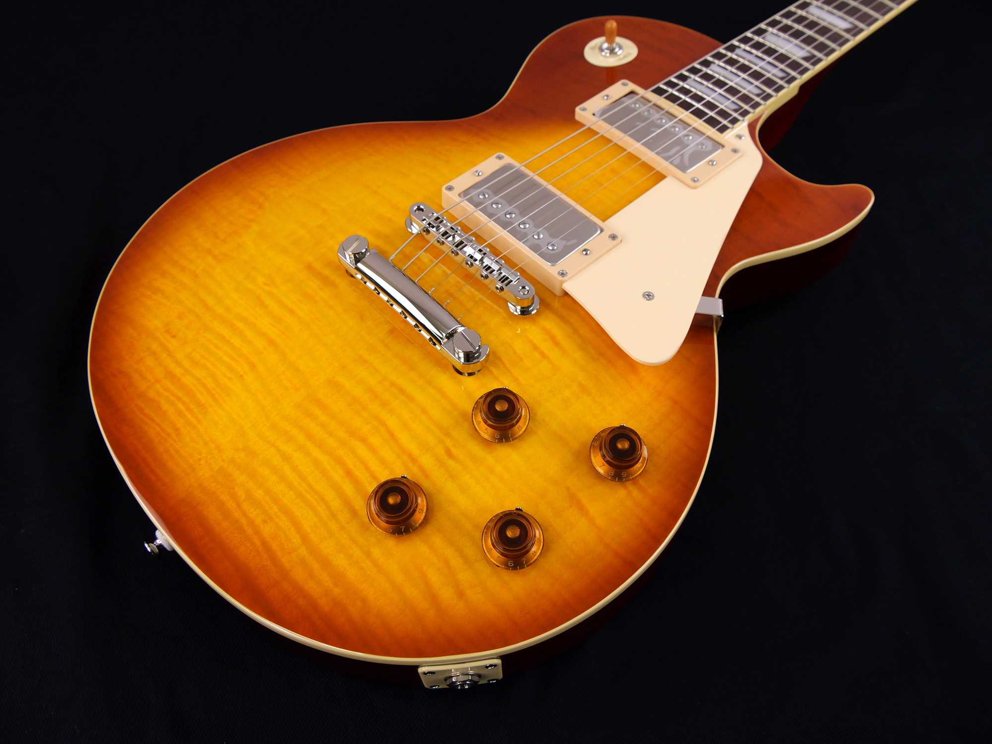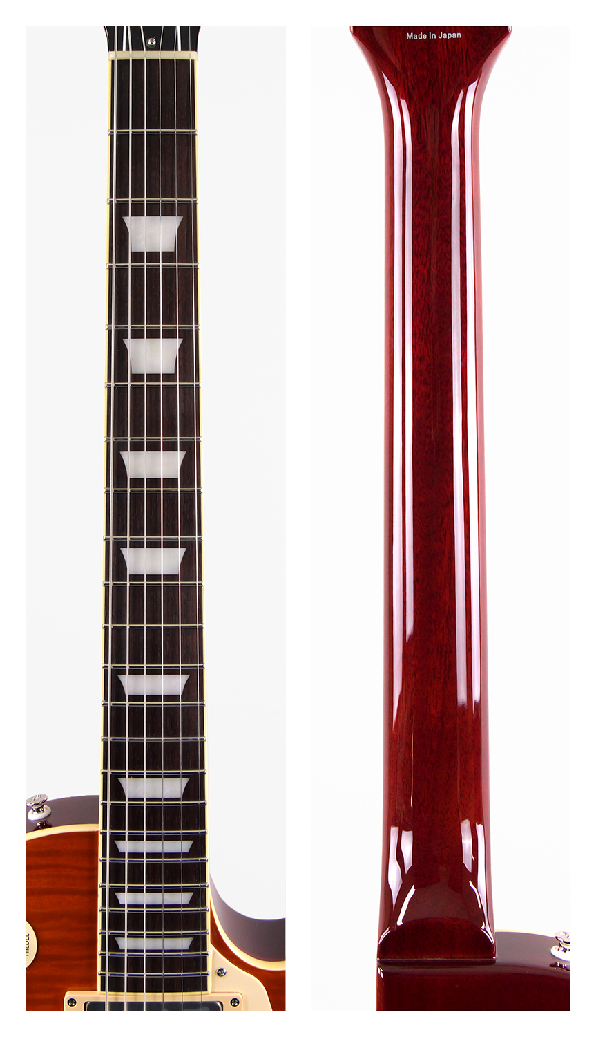 フレイム・メイプルをトップにラミネートした王道のレスポール・スタンダード・スタイル。ネックとボディの接合には伝統的なニカワ接着が採用されており、セットネックならではの響きの一体感がしっかりと感じられます。