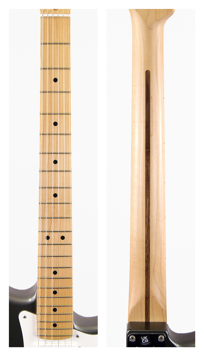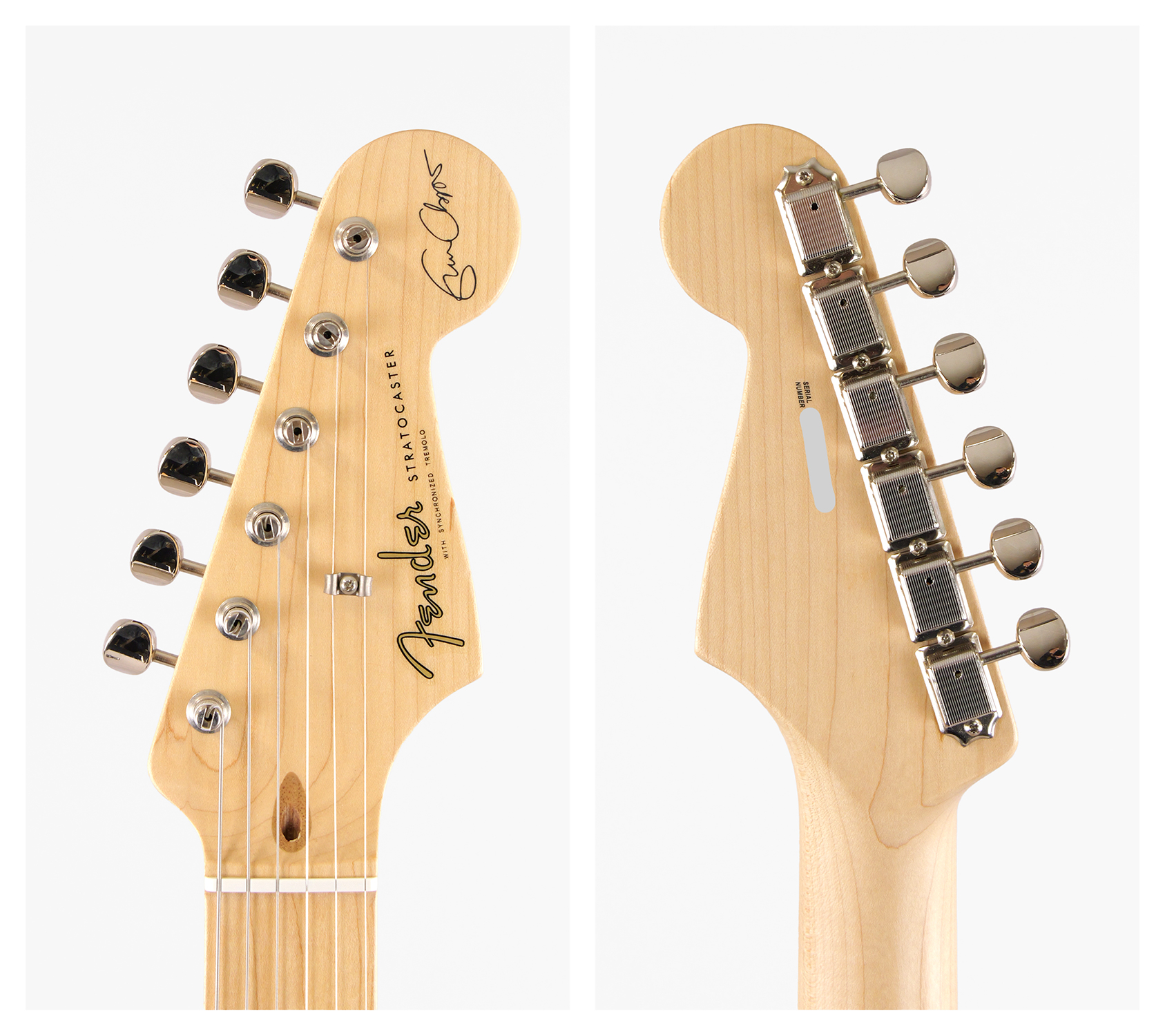 アルダーボディに、3基のVintage Noiseless ピックアップを搭載。25dbアクティヴミッドブースト回路によって、このモデル特有のサウンドを演出します。本人の仕様に基づき、特別なVシェイプのネックにブロックされたトレモロユニットを採用しています。