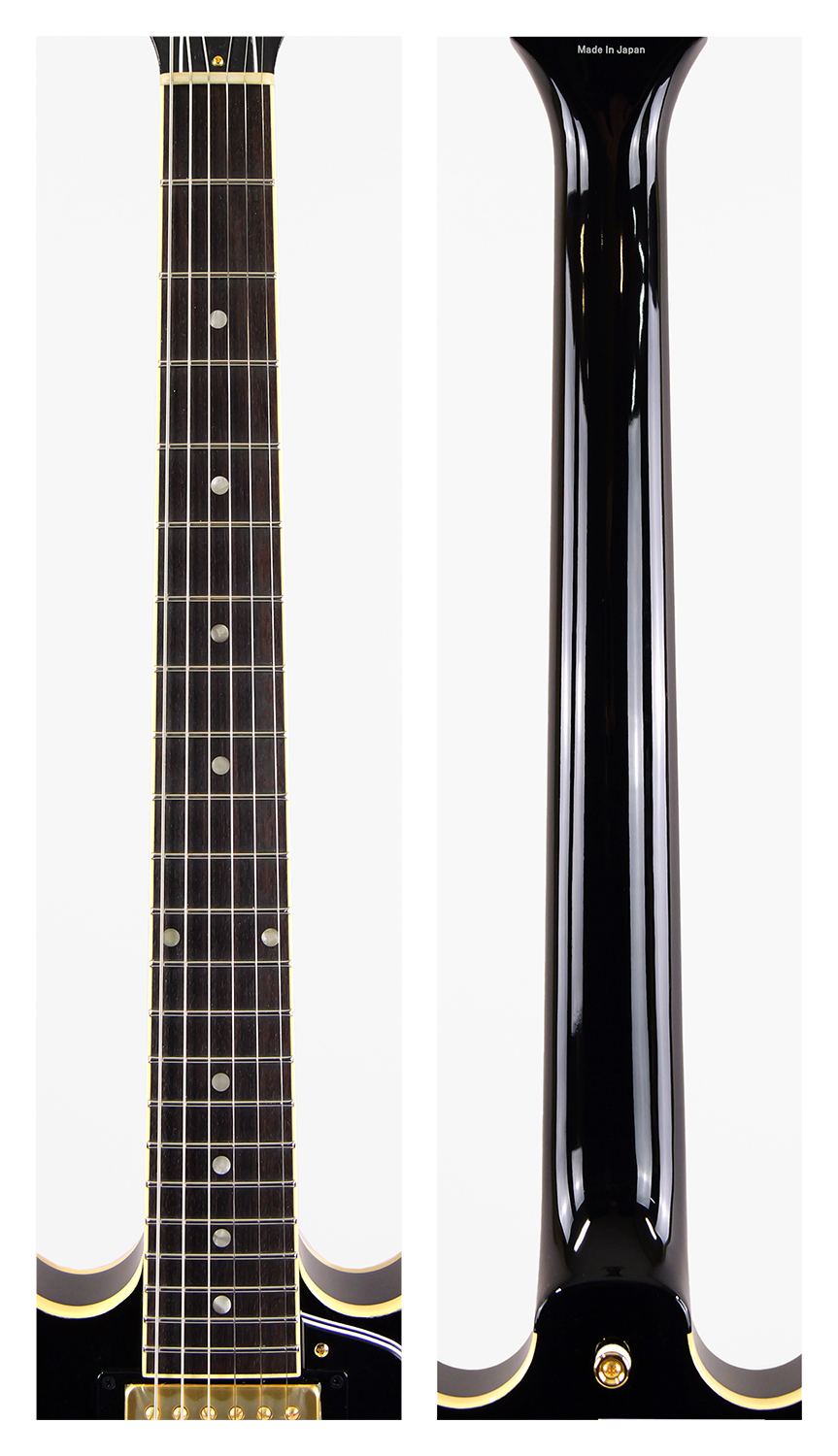 ネックとボディの接合には伝統的なニカワ接着が採用されており、セットネックならではの響きの一体感がしっかりと感じられます。