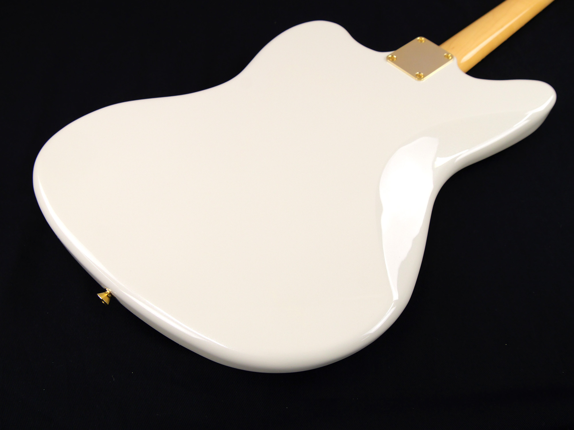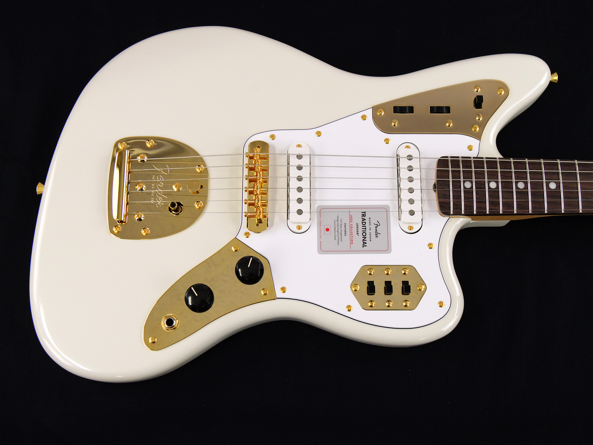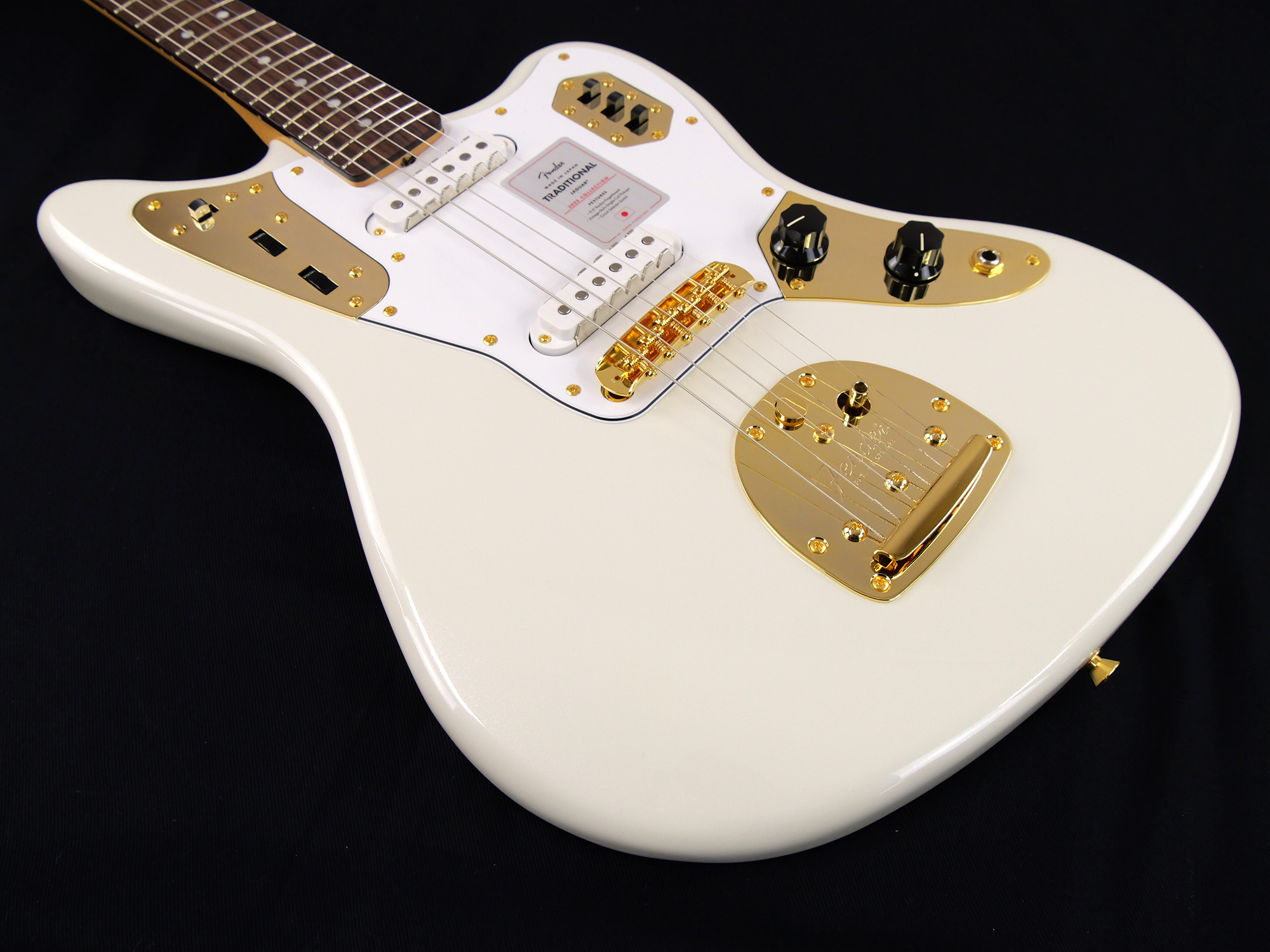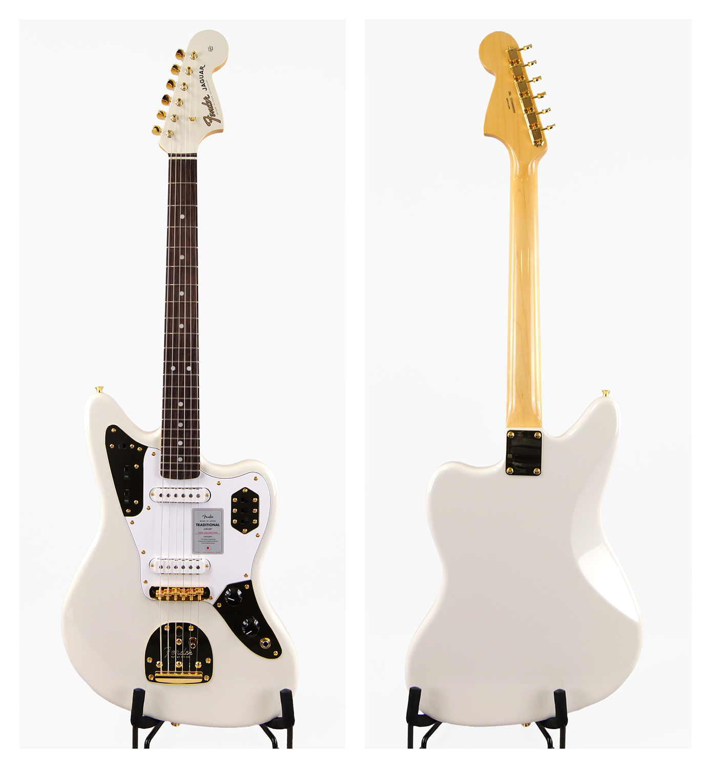 Made in Japan Traditional 2025 Collection, 60s Jaguar®は、Made in Japan Traditional 60s Jaguar®をベースに2025年限定のルックスを纏った特別なモデルです。 "Black Pearl"と"White Pearl"は、ボディとヘッドストックにこれらの製品だけの特殊なパール塗装を施しており、ゴールドに統一されたハードウェアと相まって、より一層、優雅で上品な高級感を得ることができます。 "Competition Black / 3-Color Sunburst"と"Competition 3-Color Sunburst / Aged Natural"は、従来の有彩色なコンペティションラインをあしらった製品ではなく、フェンダーの代表的なカラーである3-Color Sunburstをボディデザインに溶け込ませることで、3本ラインの中から、違った角度のフェンダーらしさを感じることができる製品です。