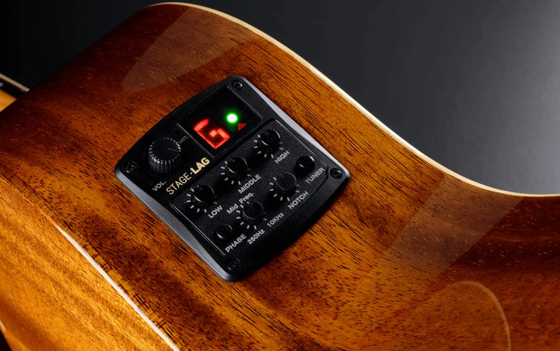 Stage LAGプリアンプを搭載。クリアかつダイナミックに増幅されたサウンドを出力し、ギターの音響特性を忠実に再現します。 グロス仕上げが手摘みされた木材の美しさを強調し、さらに洗練された質感を加えます。