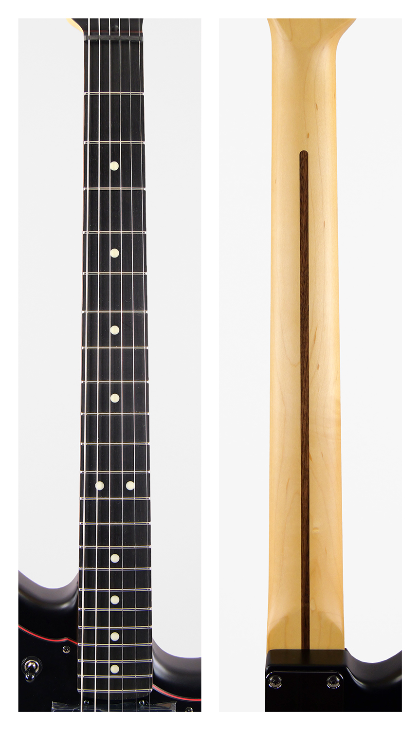 目を引くレッドのセンターレイヤーを纏った3-Plyブラックピックガードを搭載しており、ヘッドのレッドメタルロゴと相まって独特な雰囲気を醸し出します。金属パーツやプラスチックパーツは全てブラックで統一しており、ナットもSynthetic Boneを搭載。よりヘビーな見た目に仕上げています。