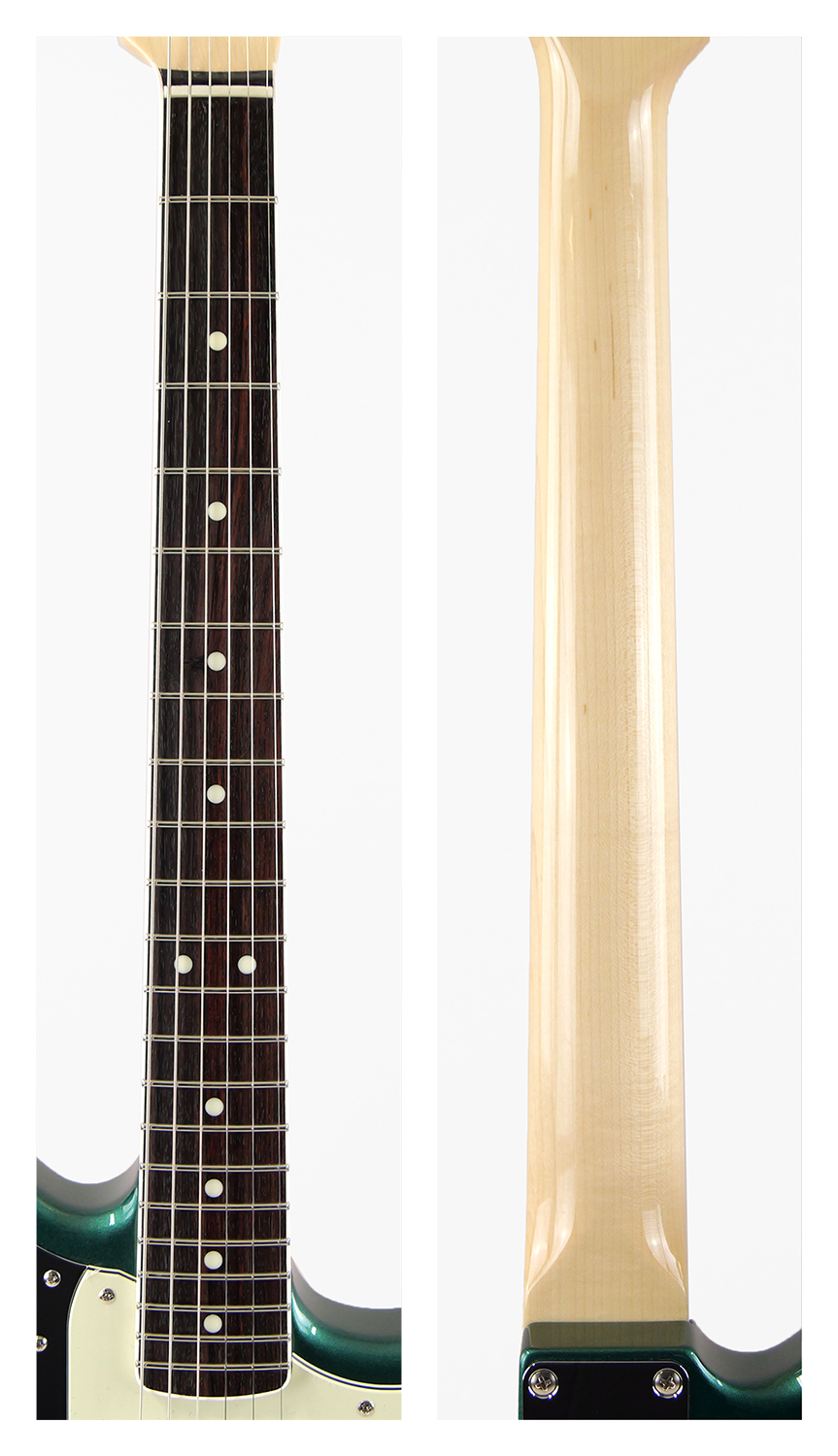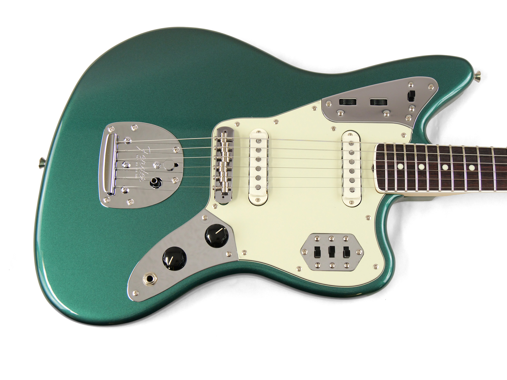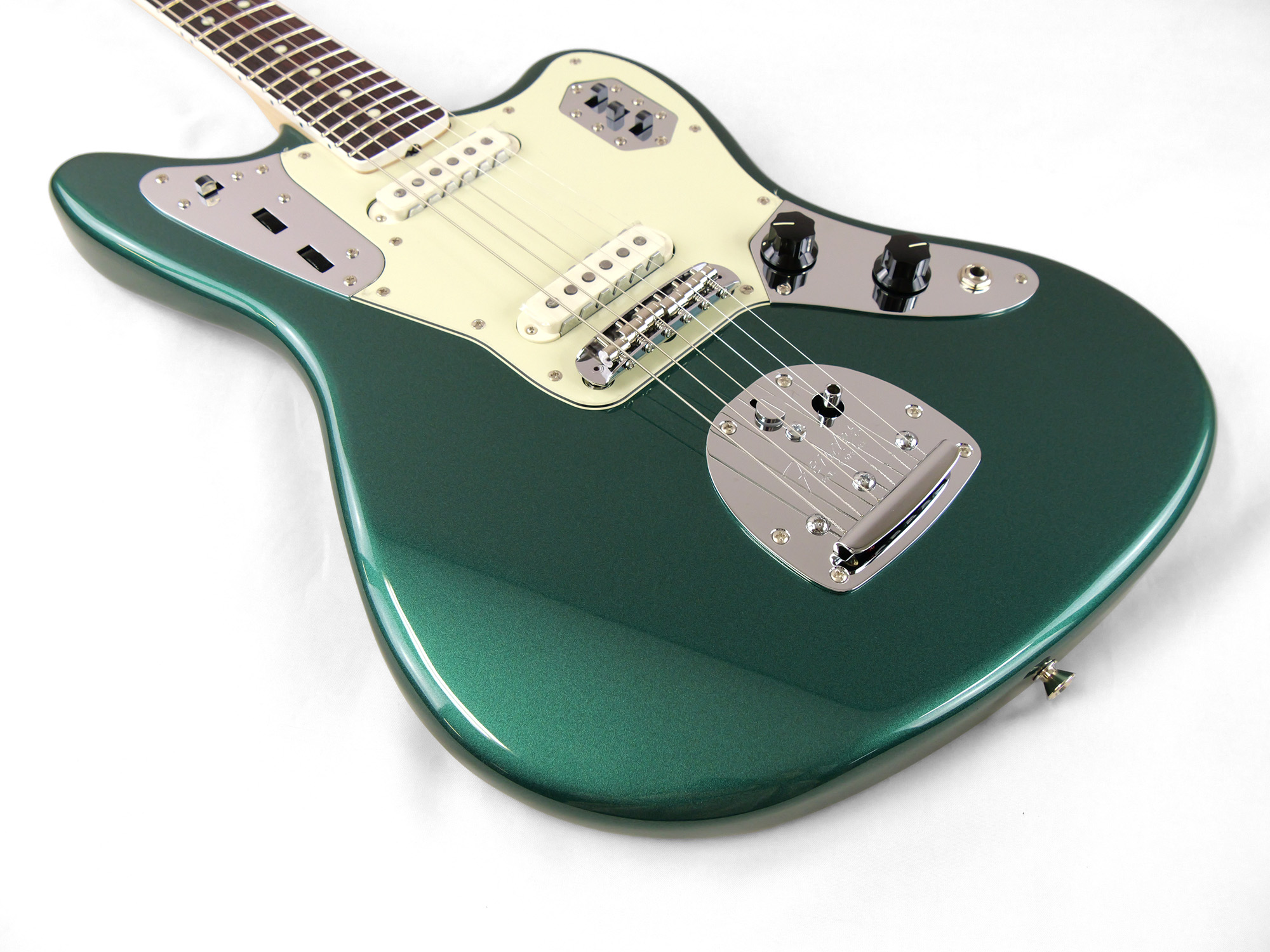 Made in Japan Traditional 60s Jaguar を基に、ボディ材をアルダーに、ピックアップをPure Vintage '65 Single-Coil Jaguarにアップグレード、ネックシェイプをMid '60s "C"、指板Rをヴィンテージ同様に7.25Radius、フレットをミディアム・ジャンボ・サイズ変更、ブリッジ・サドルを弦ズレの少ないムスタング・タイプに変更。