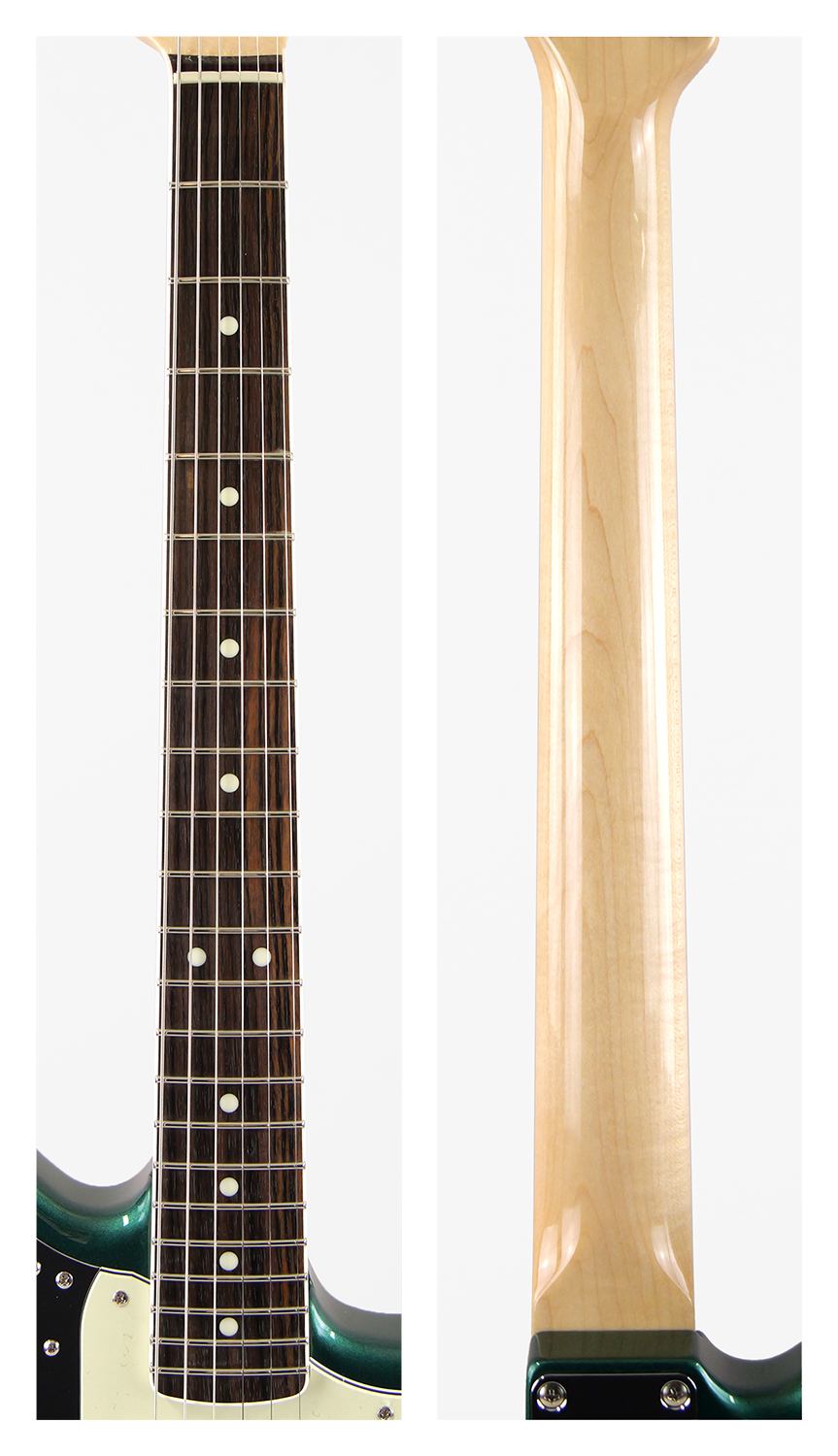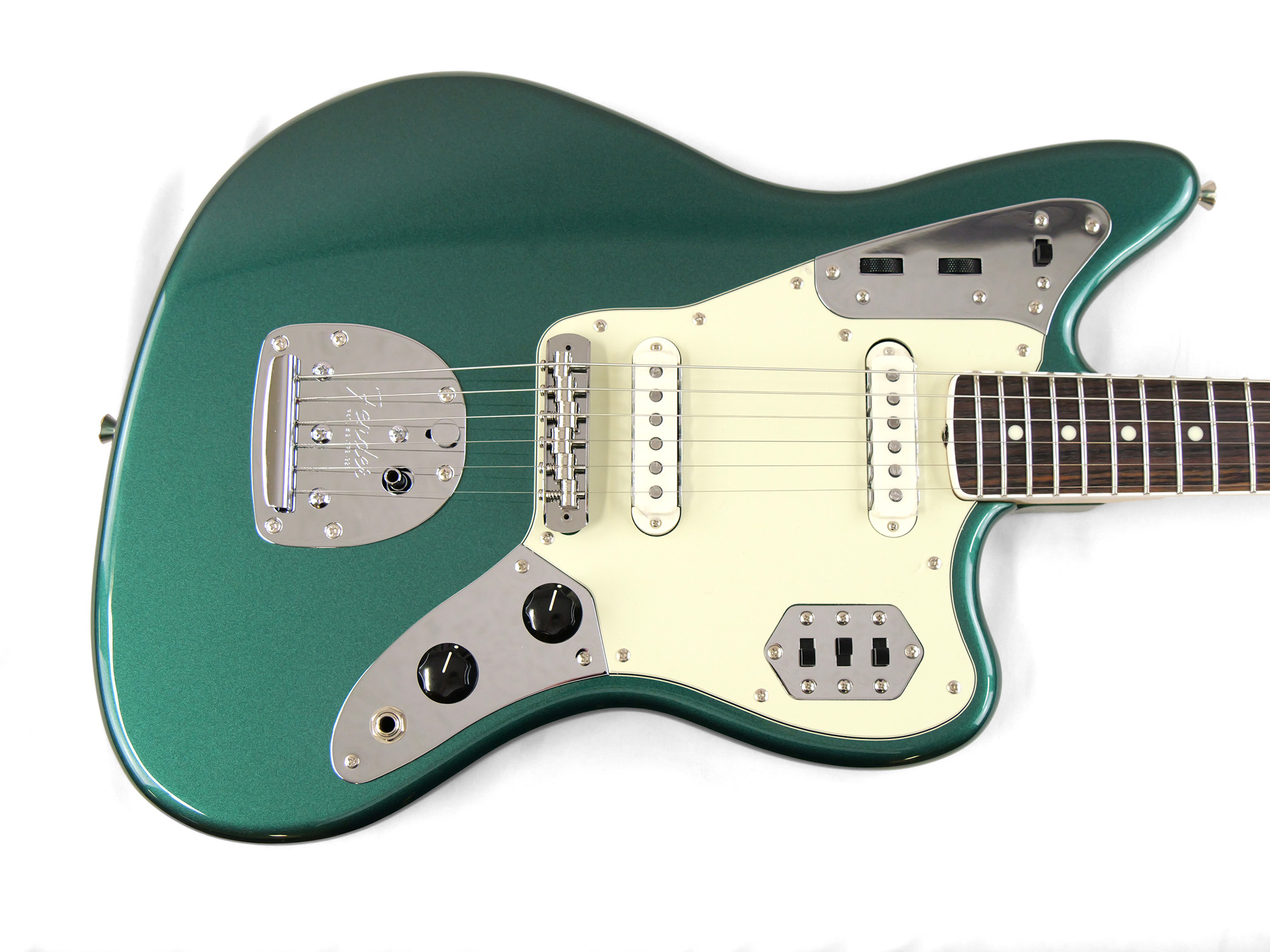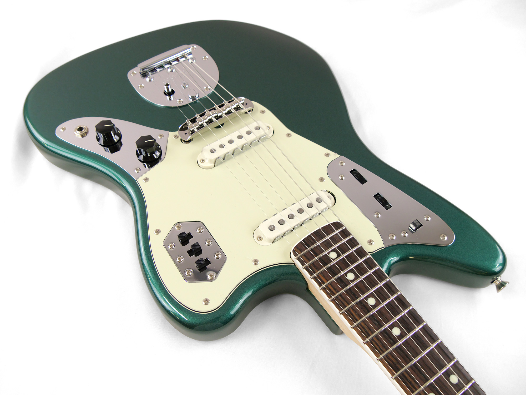 Made in Japan Traditional 60s Jaguar を基に、ボディ材をアルダーに、ピックアップをPure Vintage '65 Single-Coil Jaguarにアップグレード、ネックシェイプをMid '60s "C"、指板Rをヴィンテージ同様に7.25Radius、フレットをミディアム・ジャンボ・サイズ変更、ブリッジ・サドルを弦ズレの少ないムスタング・タイプに変更。