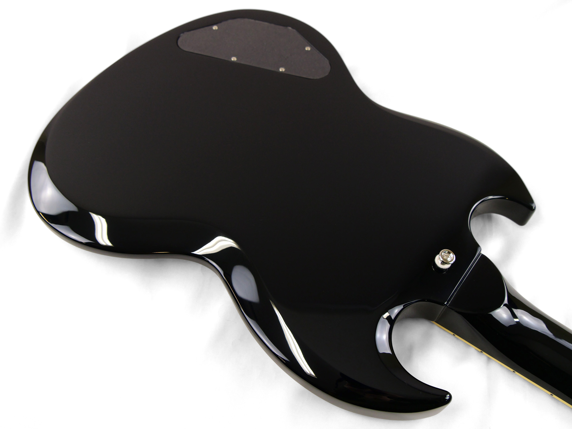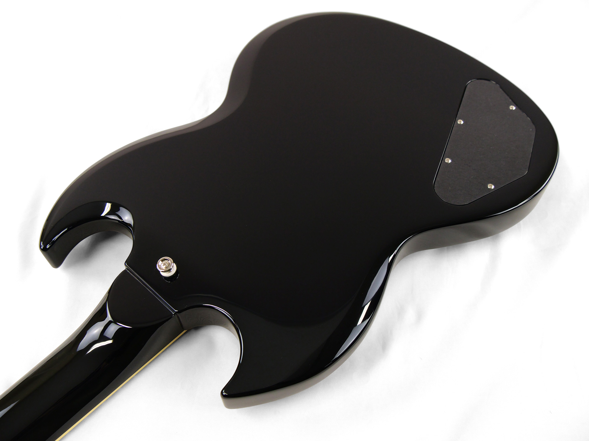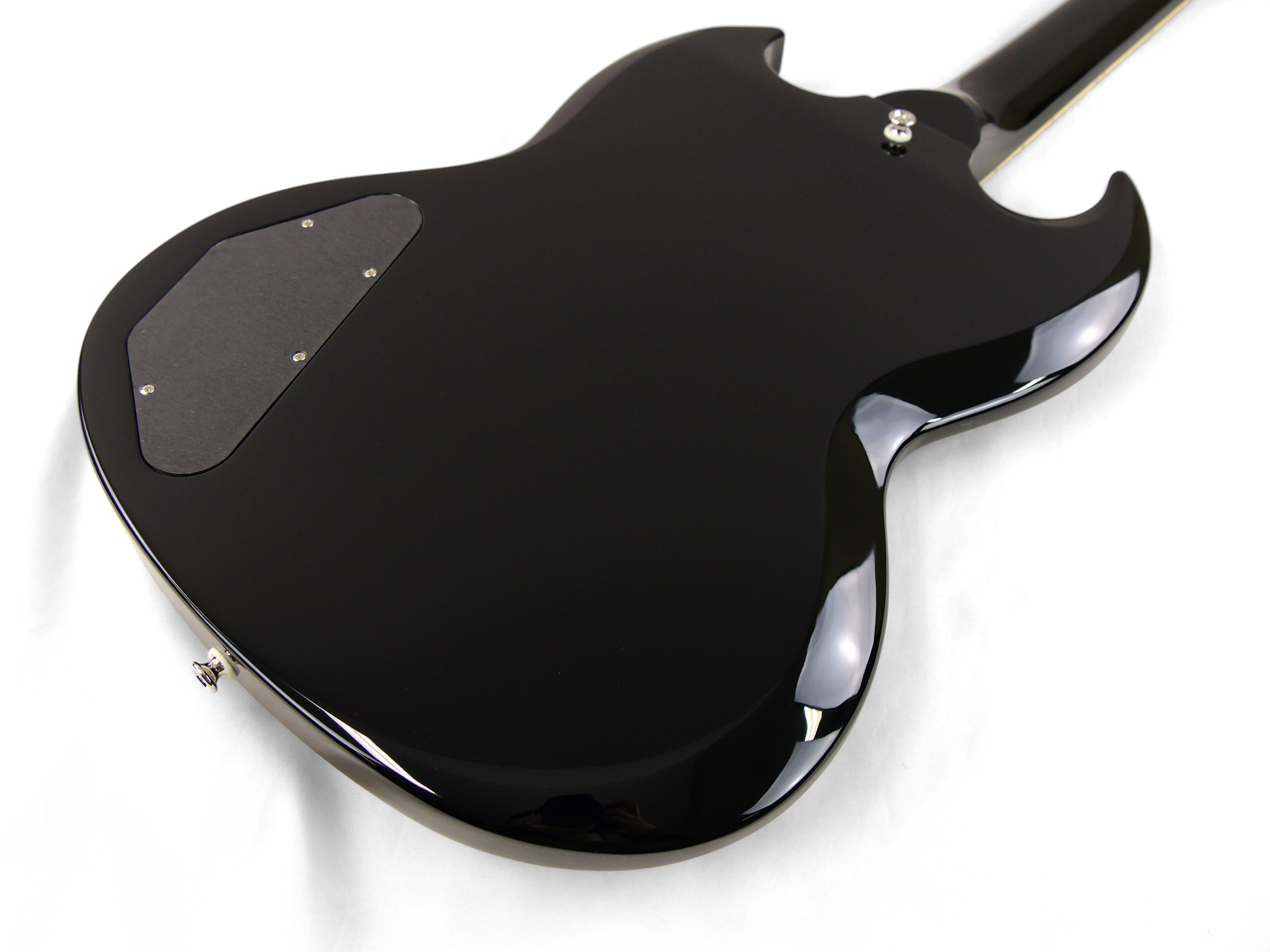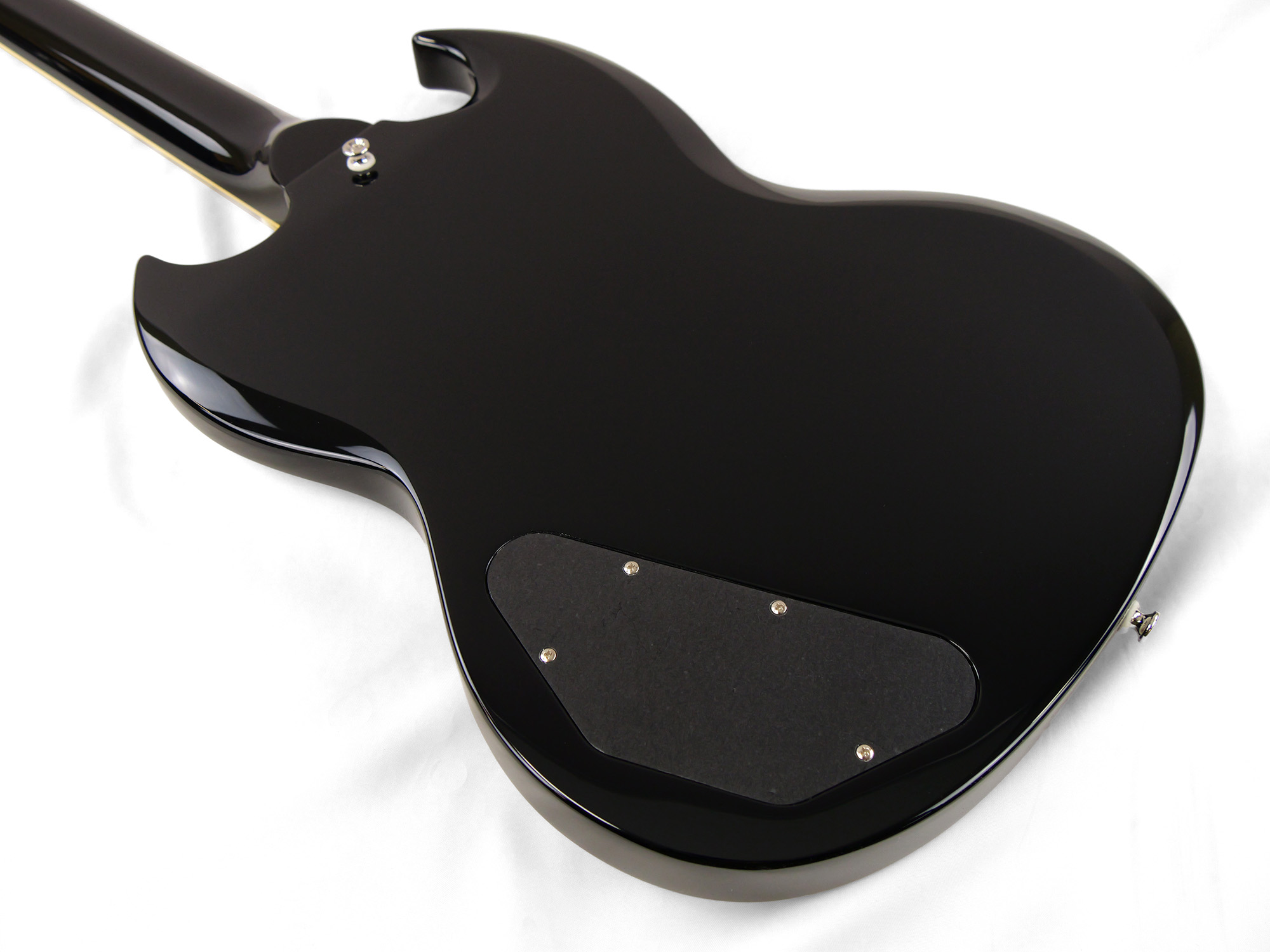 2ピースマホガニーボディ、1ピースマホガニーネックを採用したSG スタイル。ネックとボディの接合には伝統的なニカワ接着が採用されており、セットネックならではの響きの一体感がしっかりと感じられます。