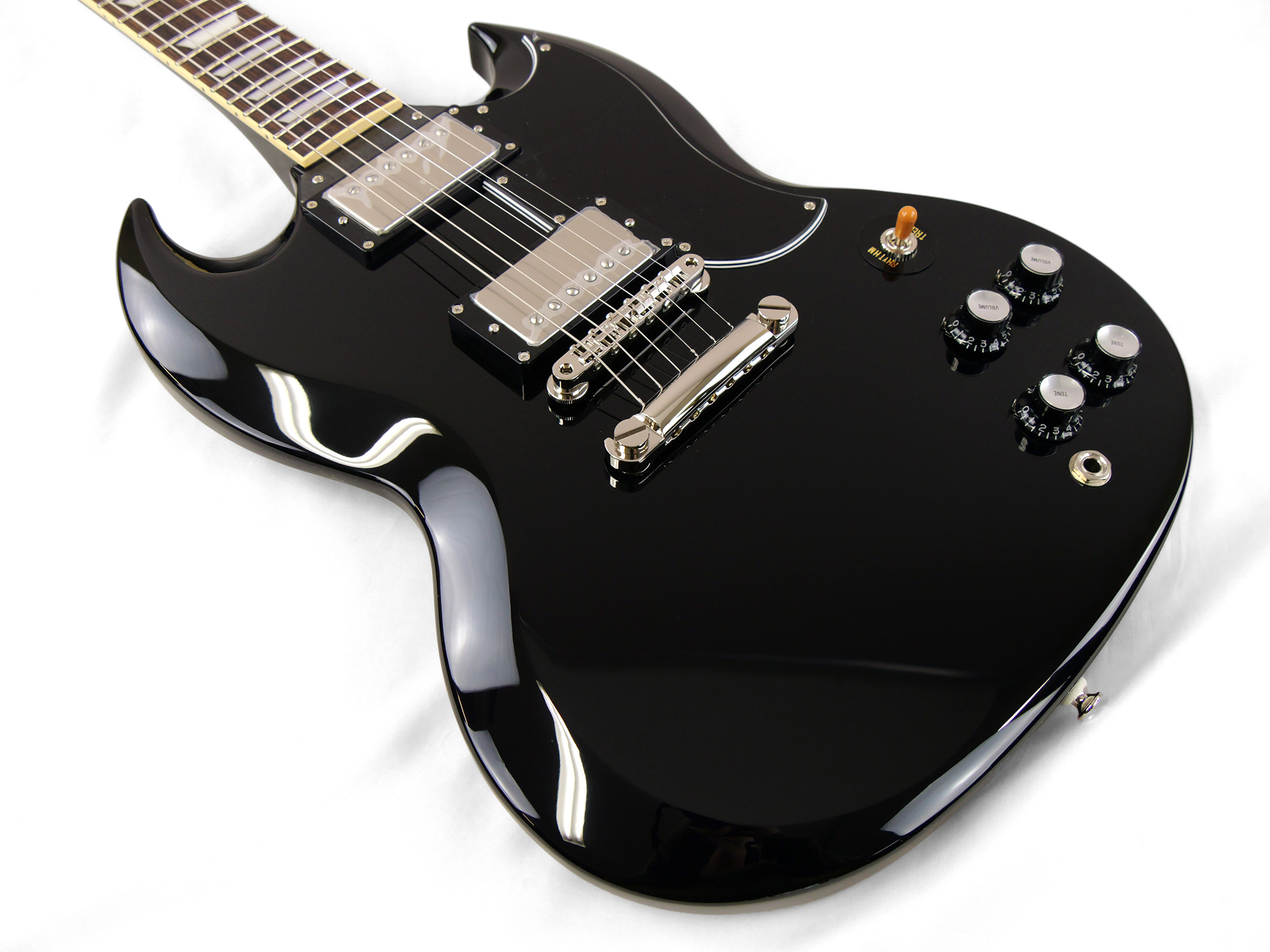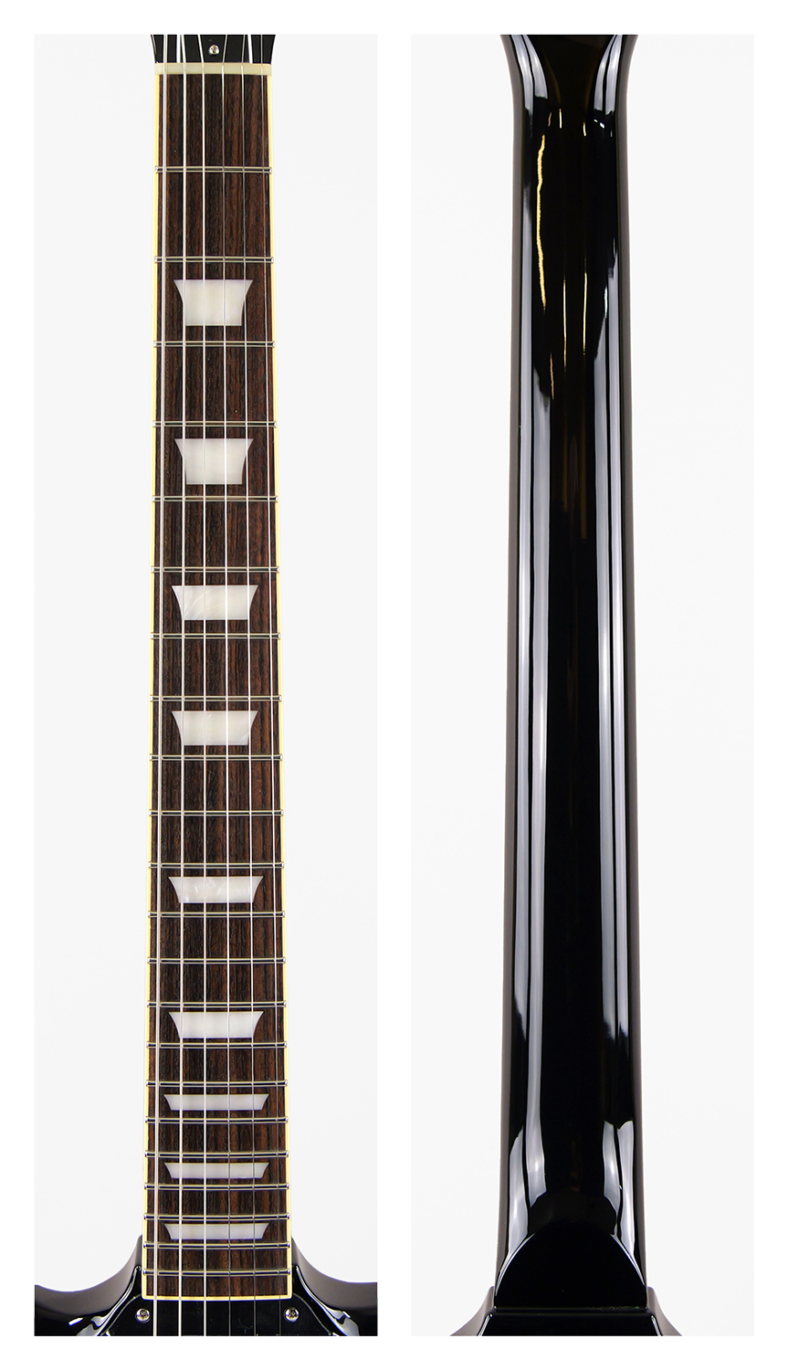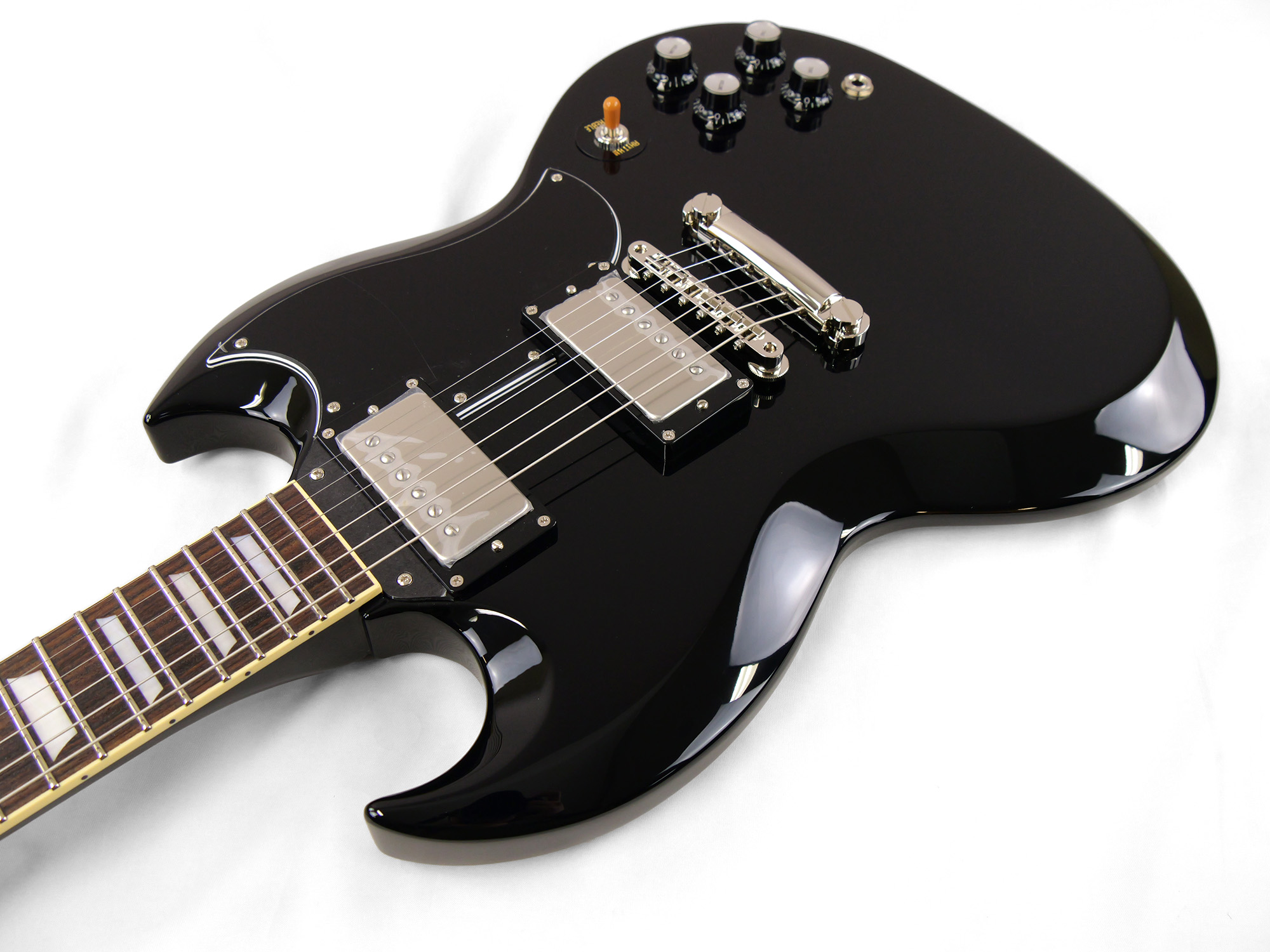 2ピースマホガニーボディ、1ピースマホガニーネックを採用したSG スタイル。ネックとボディの接合には伝統的なニカワ接着が採用されており、セットネックならではの響きの一体感がしっかりと感じられます。