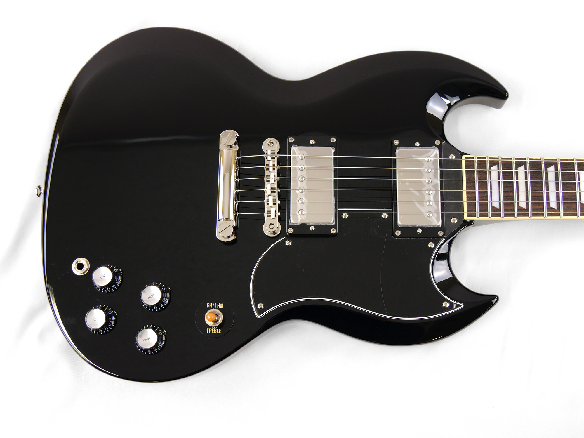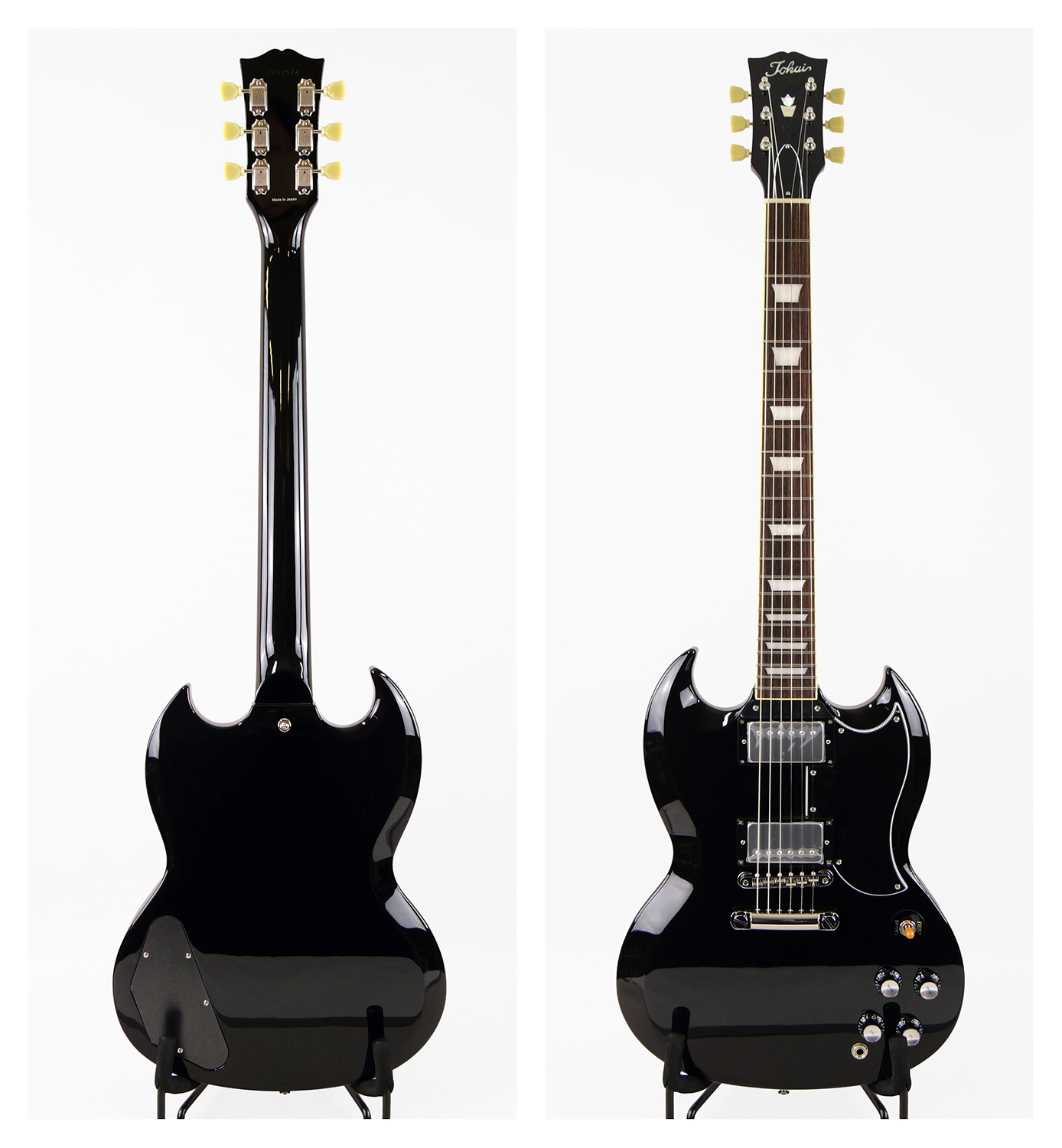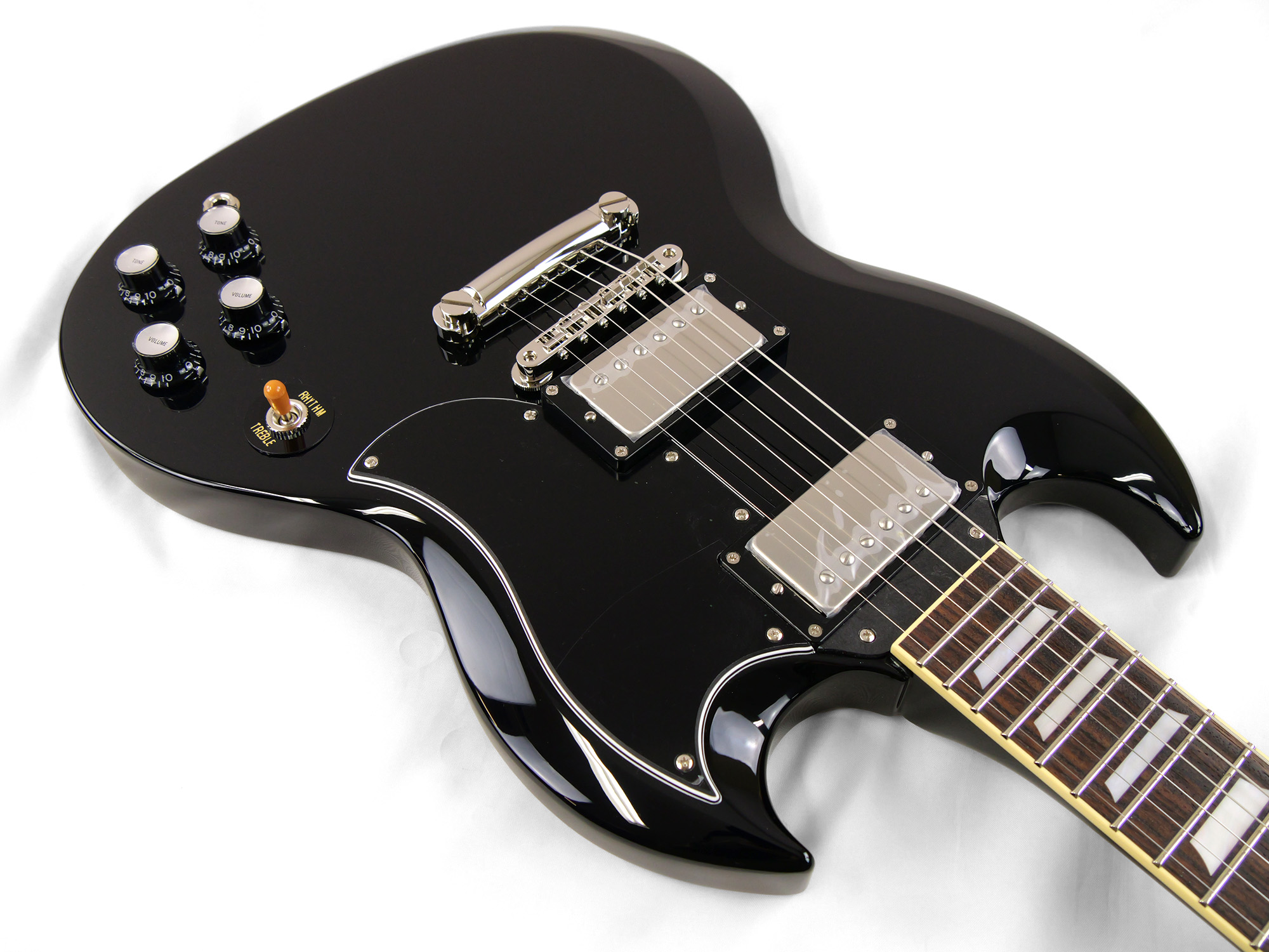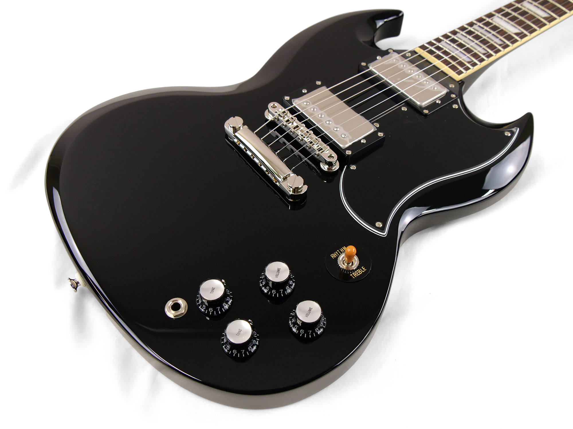2ピースマホガニーボディ、1ピースマホガニーネックを採用したSG スタイル。ネックとボディの接合には伝統的なニカワ接着が採用されており、セットネックならではの響きの一体感がしっかりと感じられます。