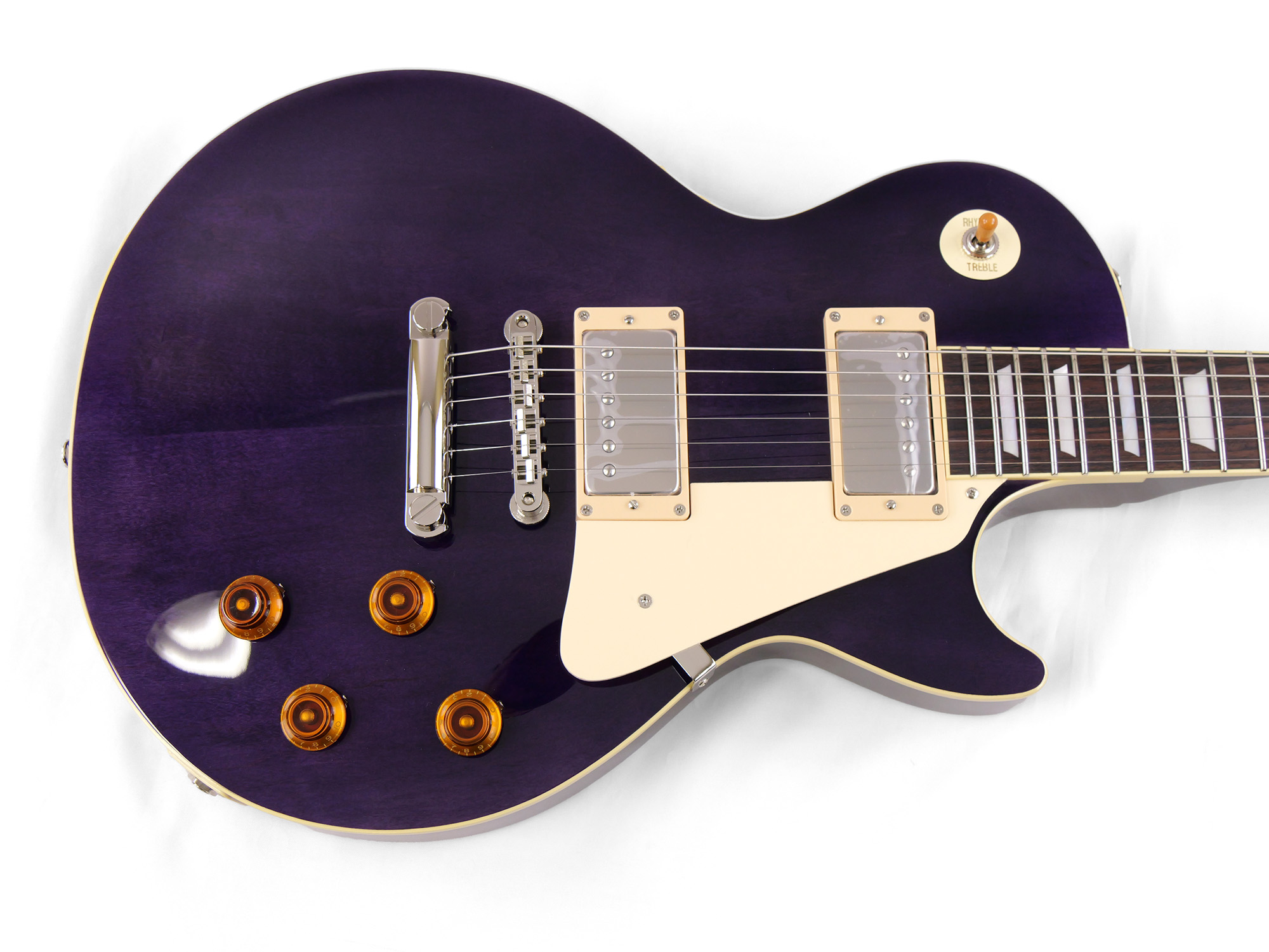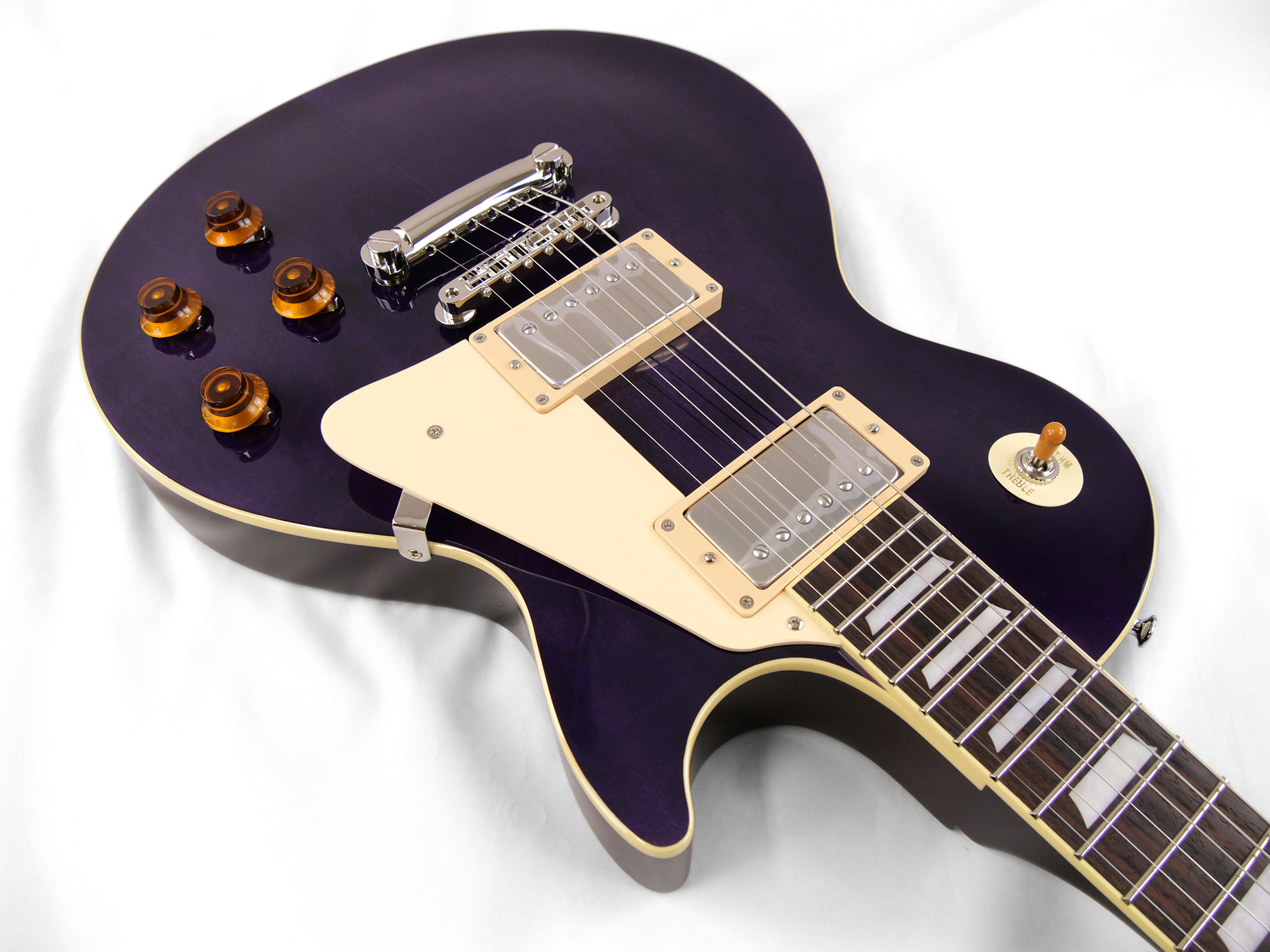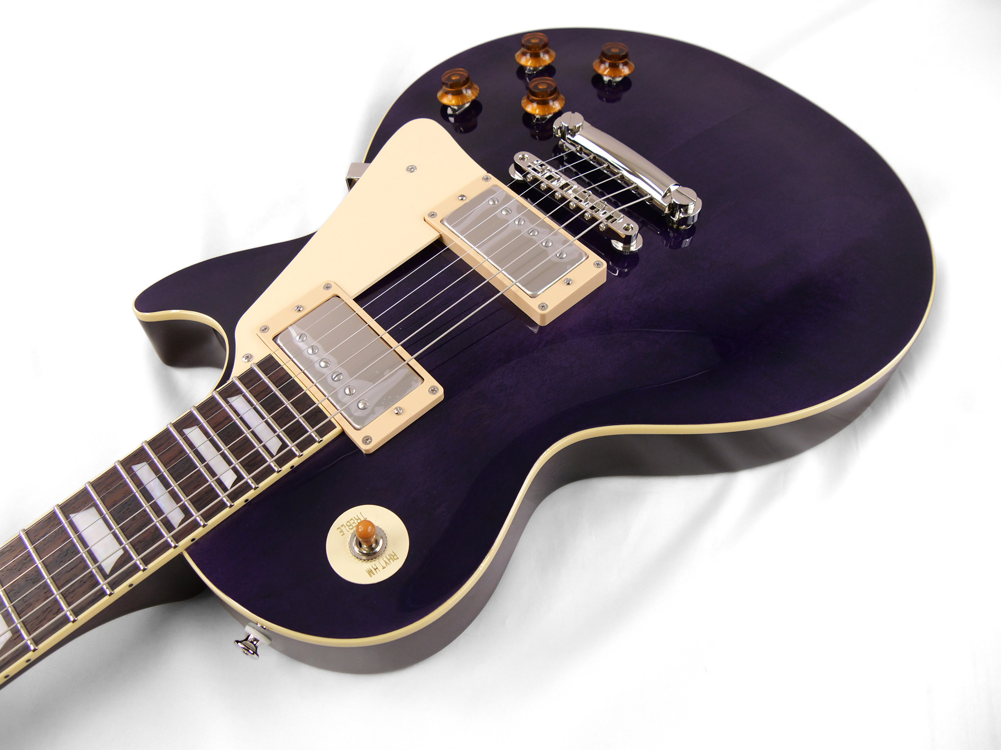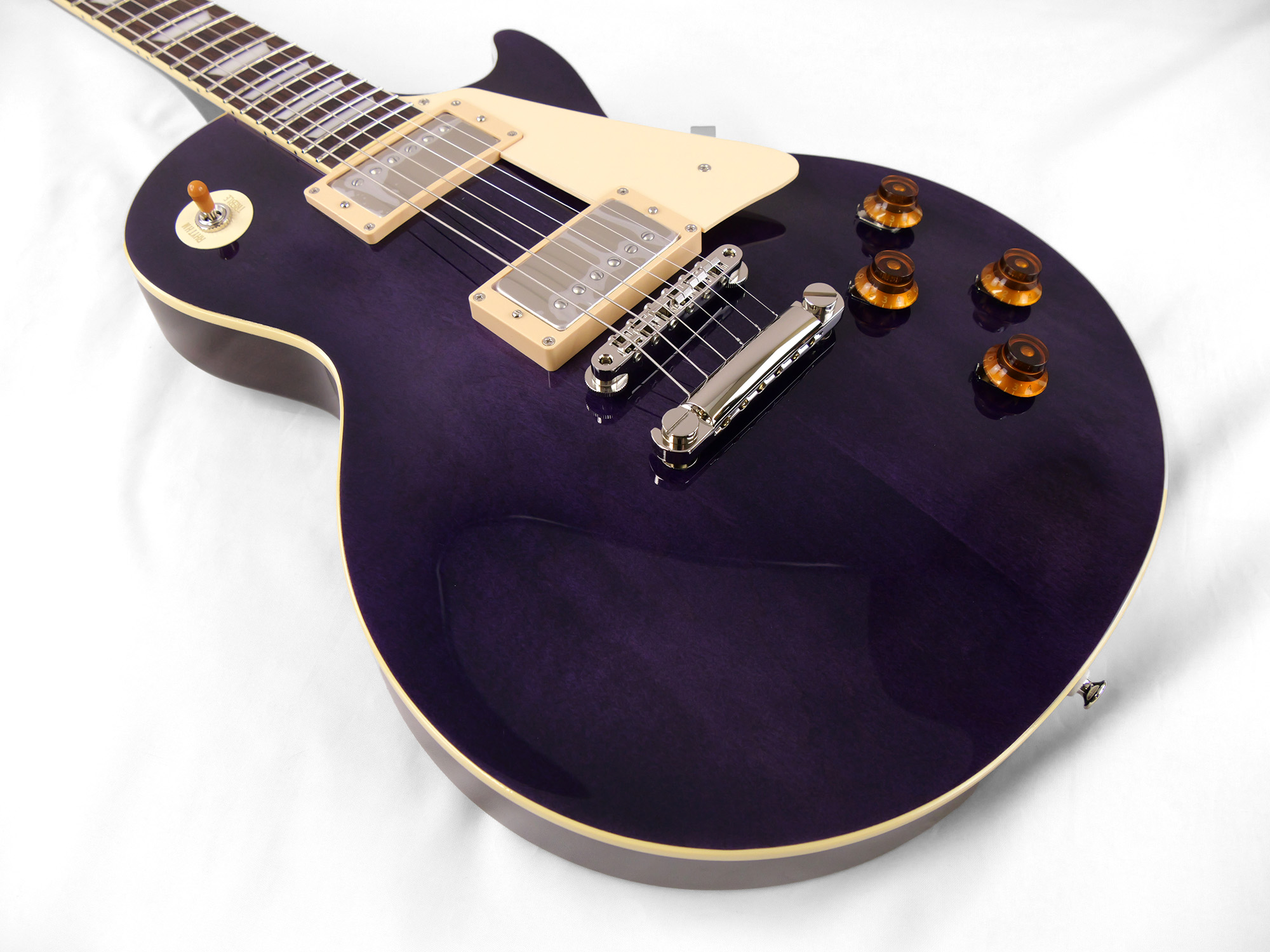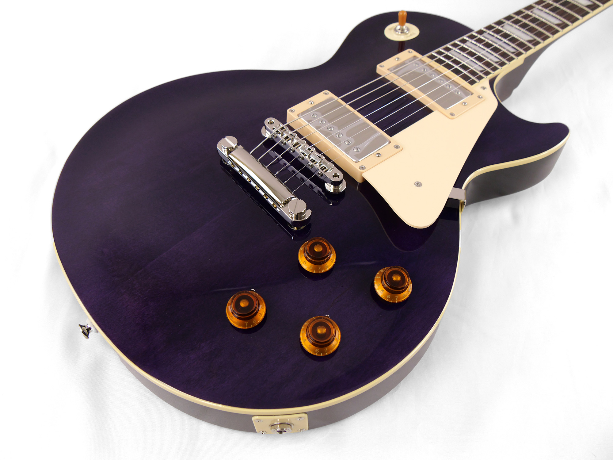 メイプルをトップにラミネートした王道のレスポール・スタンダード・スタイル。ネックとボディの接合には伝統的なニカワ接着が採用されており、セットネックならではの響きの一体感がしっかりと感じられます。