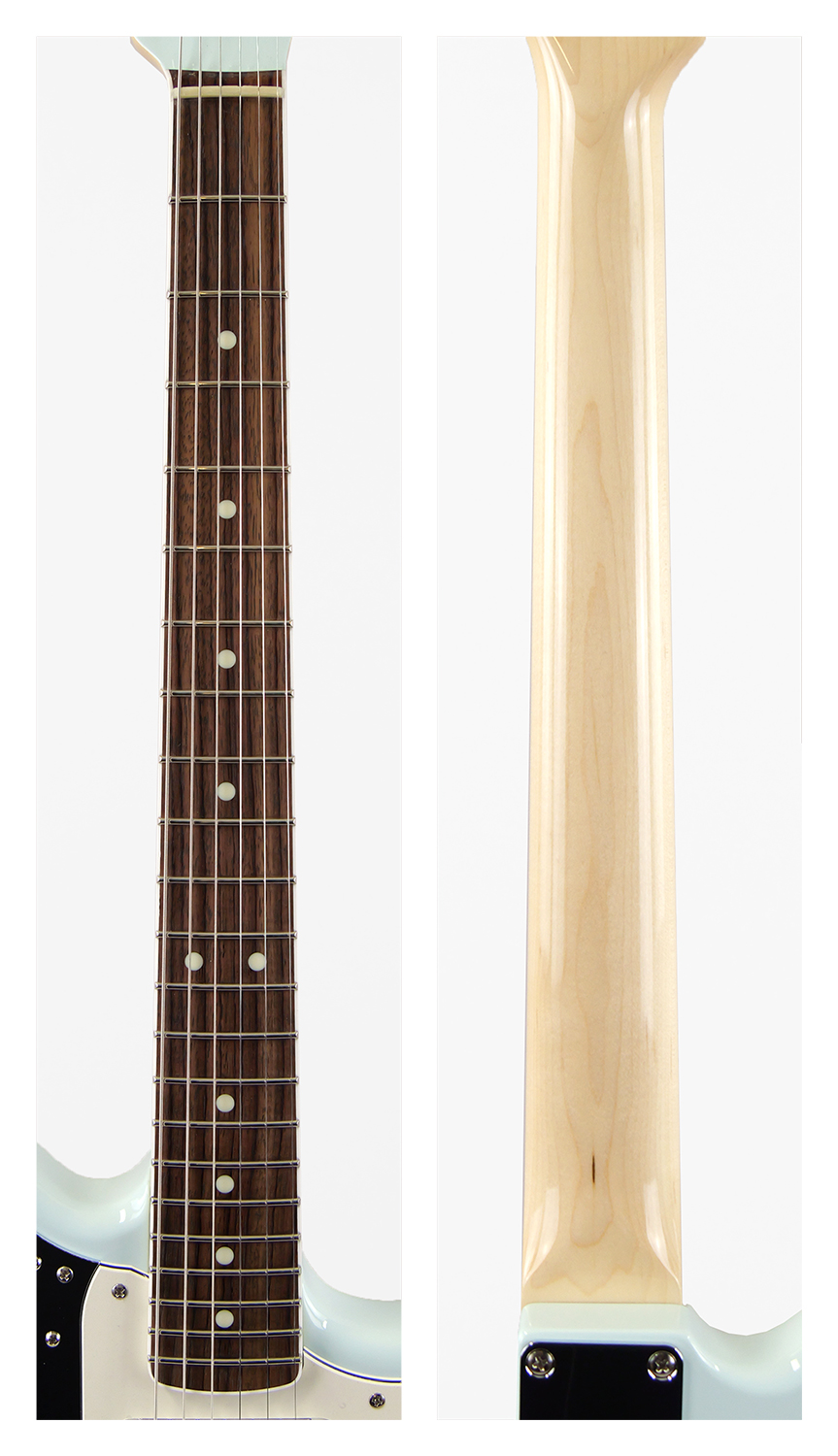 ソニック・ブルーのマッチング・ヘッド仕様、1964-1965の過渡期に使用されていたドット・ポジション・マーク、ネック・バインディングを再現。